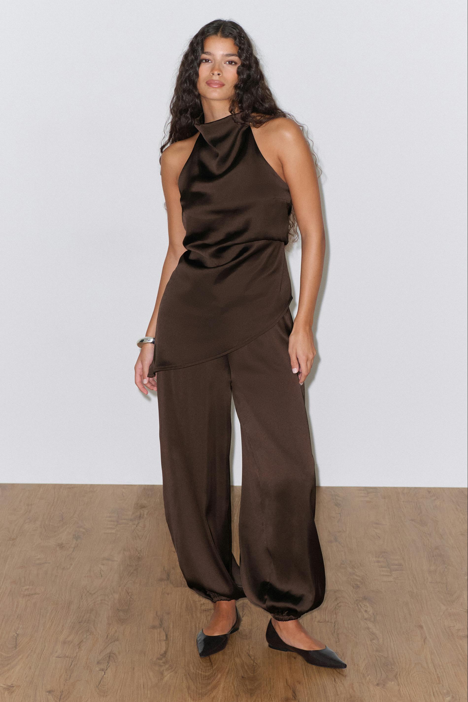 Halternecktopp i satin med öppen rygg. Toppen är brun och har en asymmetrisk design nedtill. Den har en lös passform.