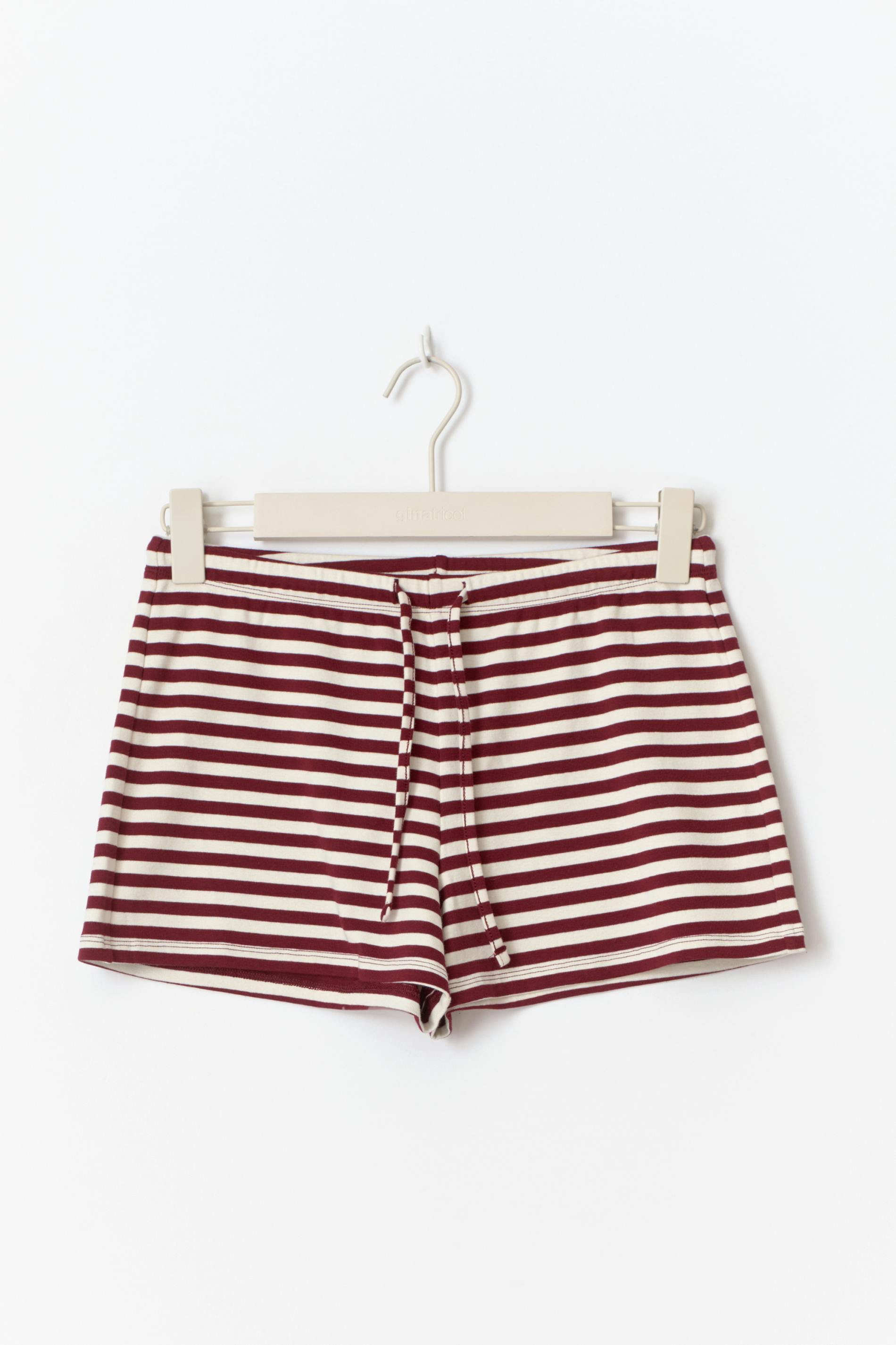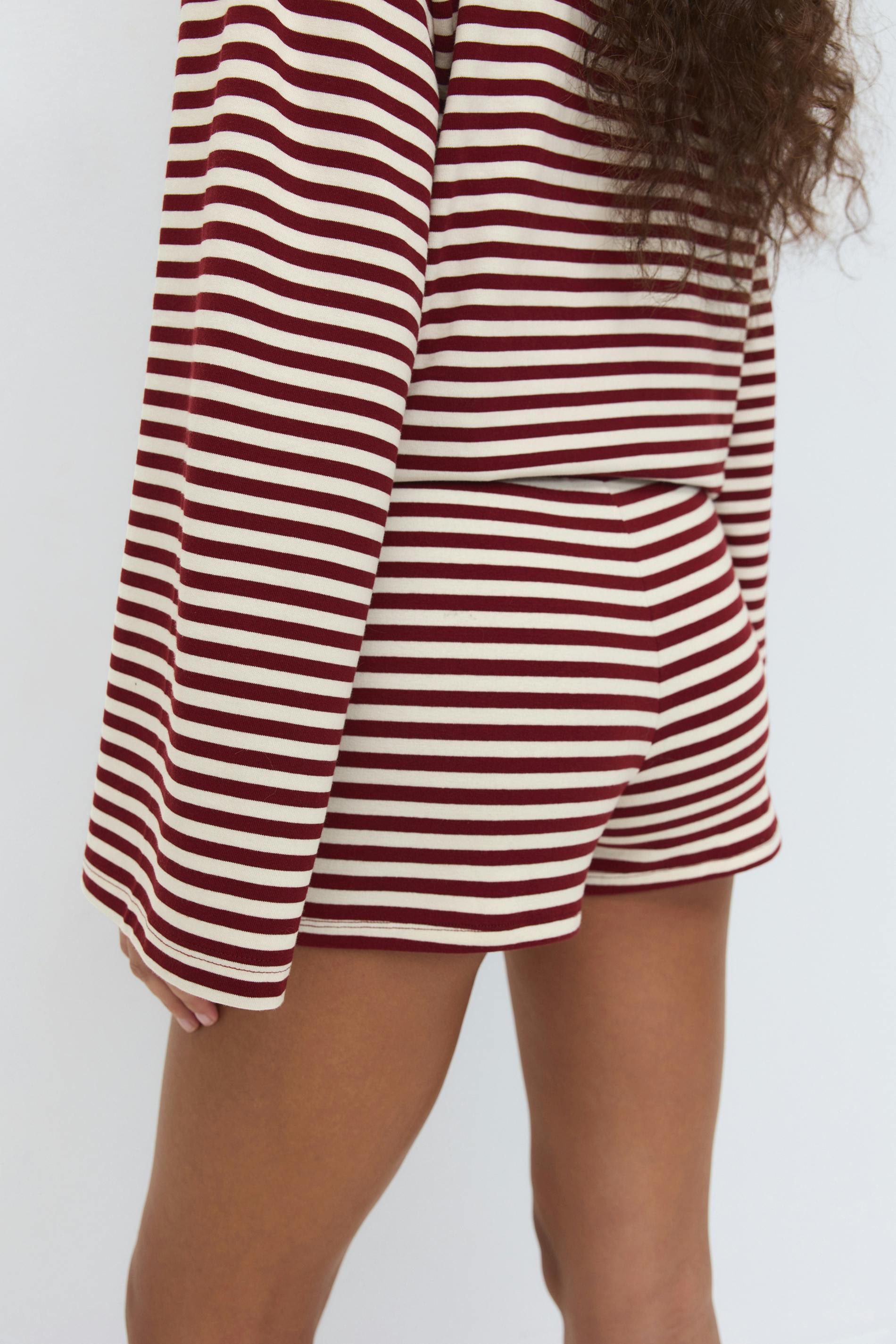 Randiga shorts med en låg midja. Shortsen är vinröda och korta och har ett mjukt, stretchigt material. De har ett knytband i midjan och en normal passform.