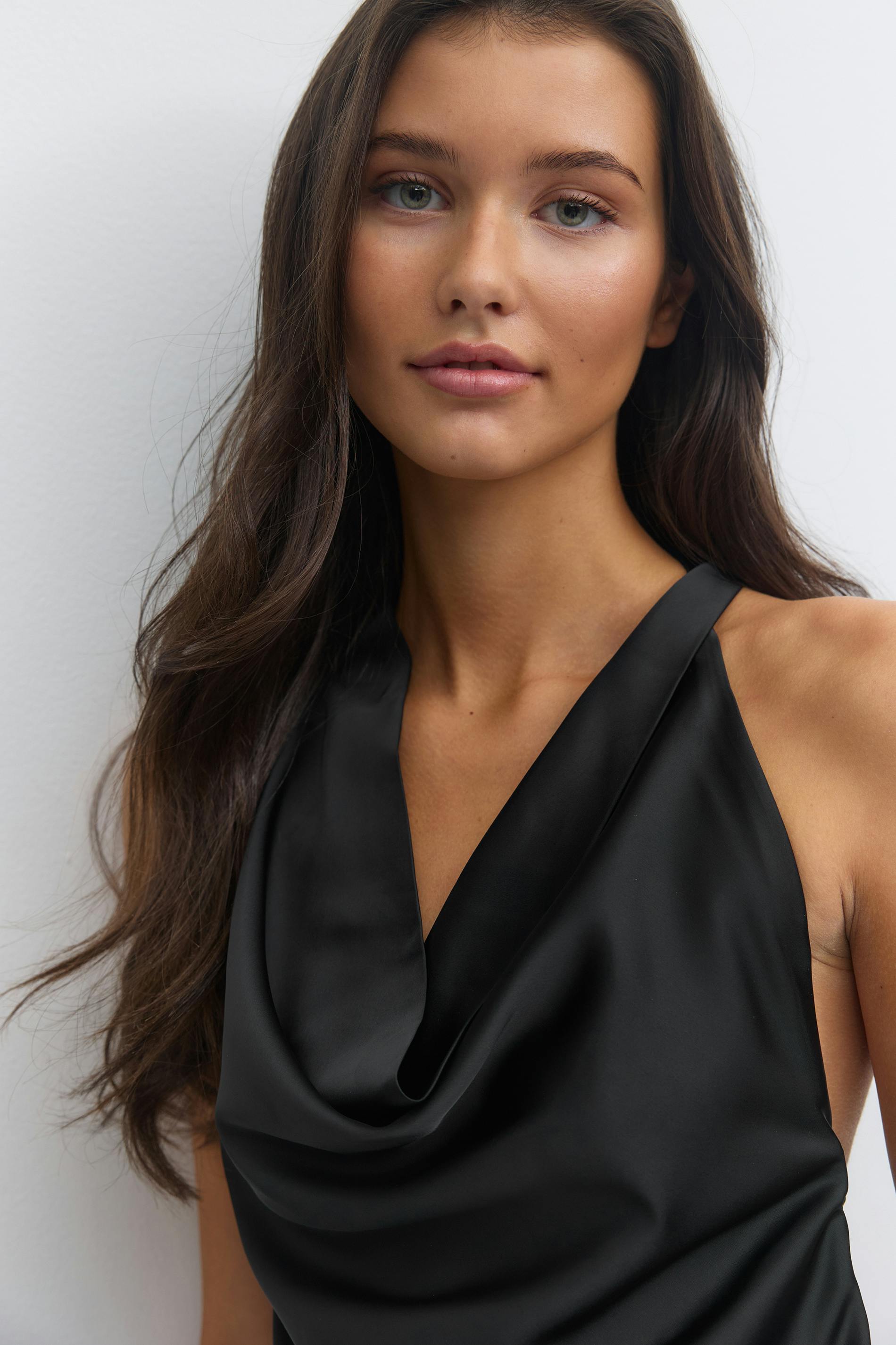 Ärmlös topp i satin med en halterneckdesign. Toppen är svart och draperad och har en djup rygg. Den har ett knytband i nacken och en normal passform.