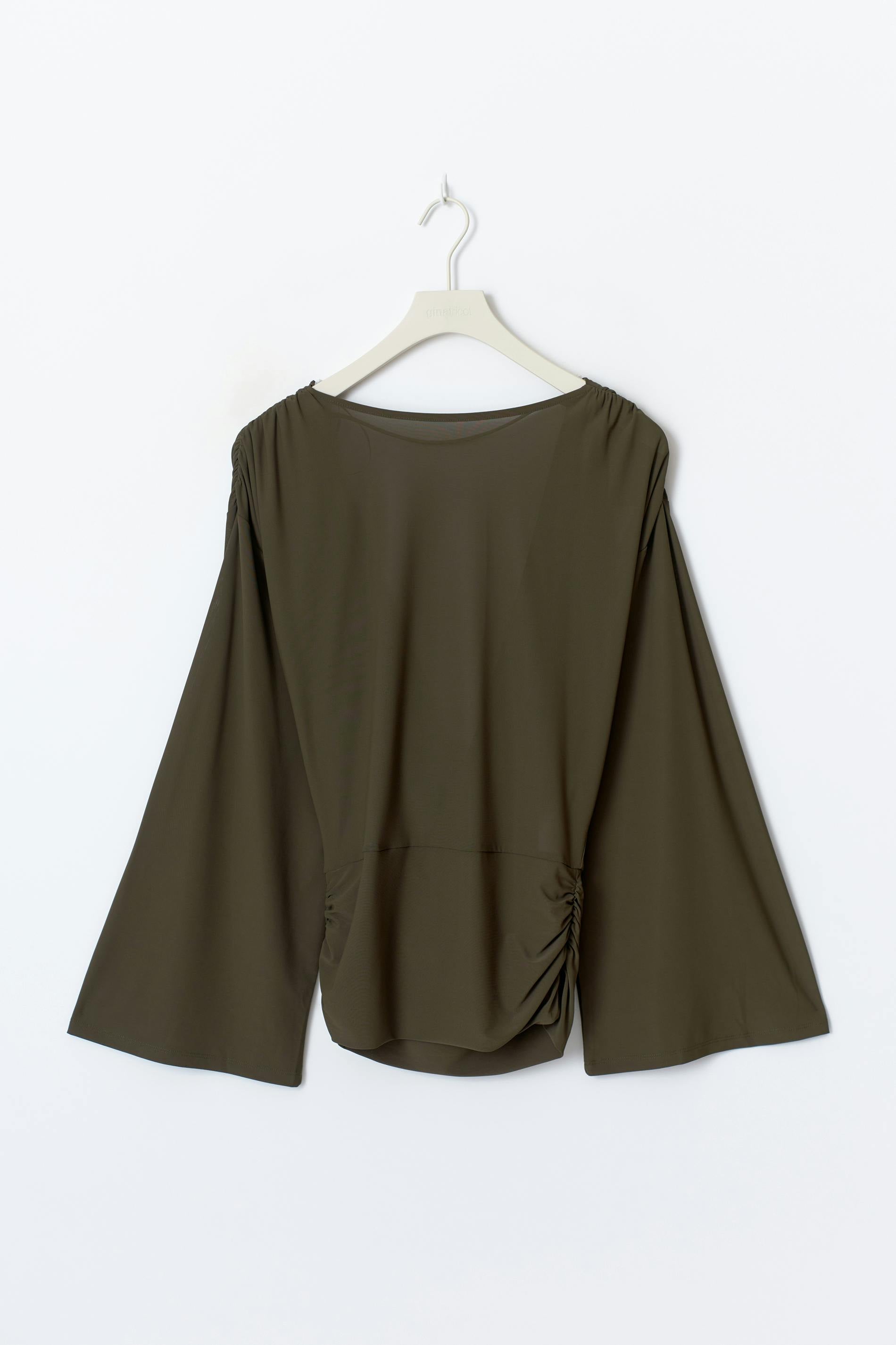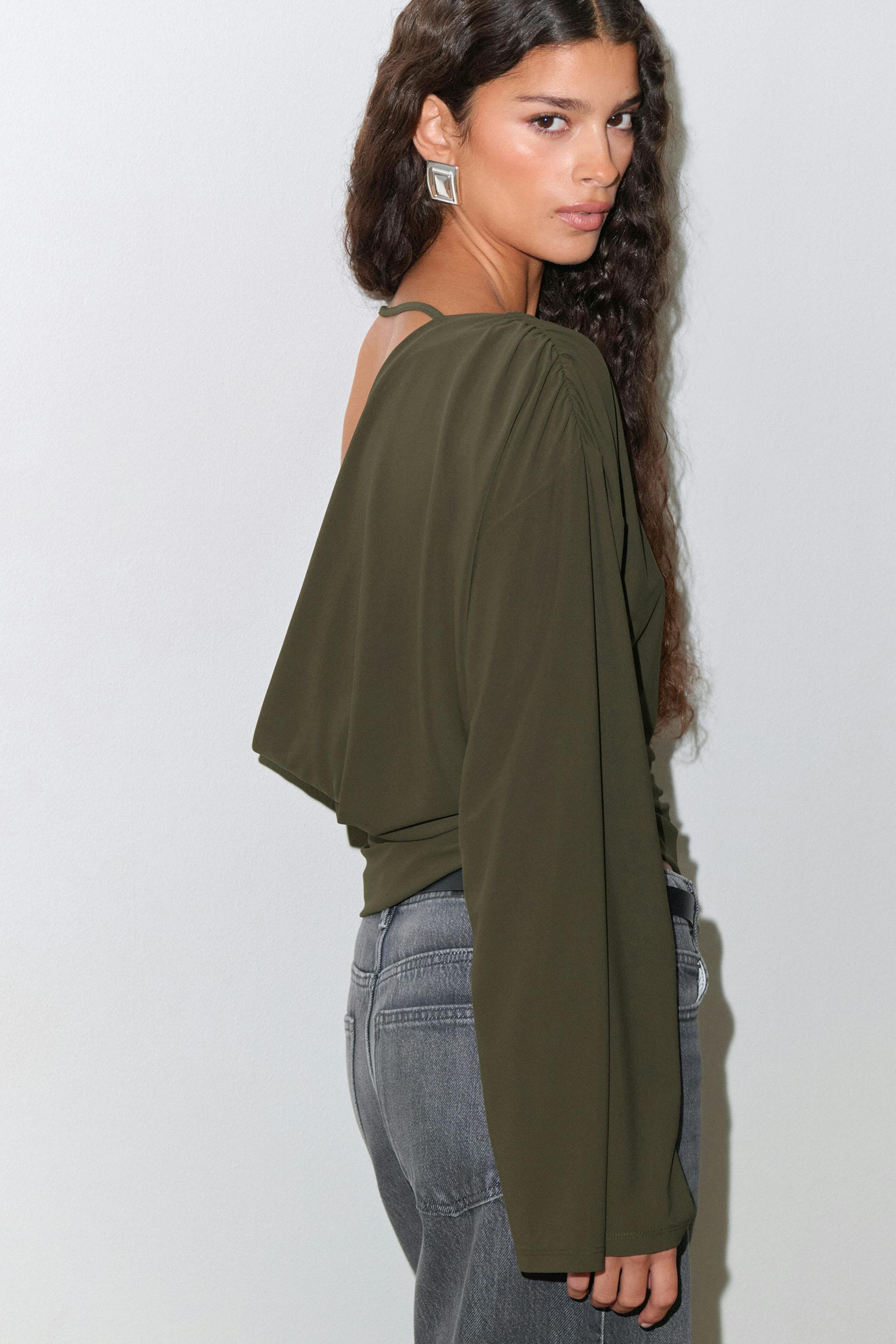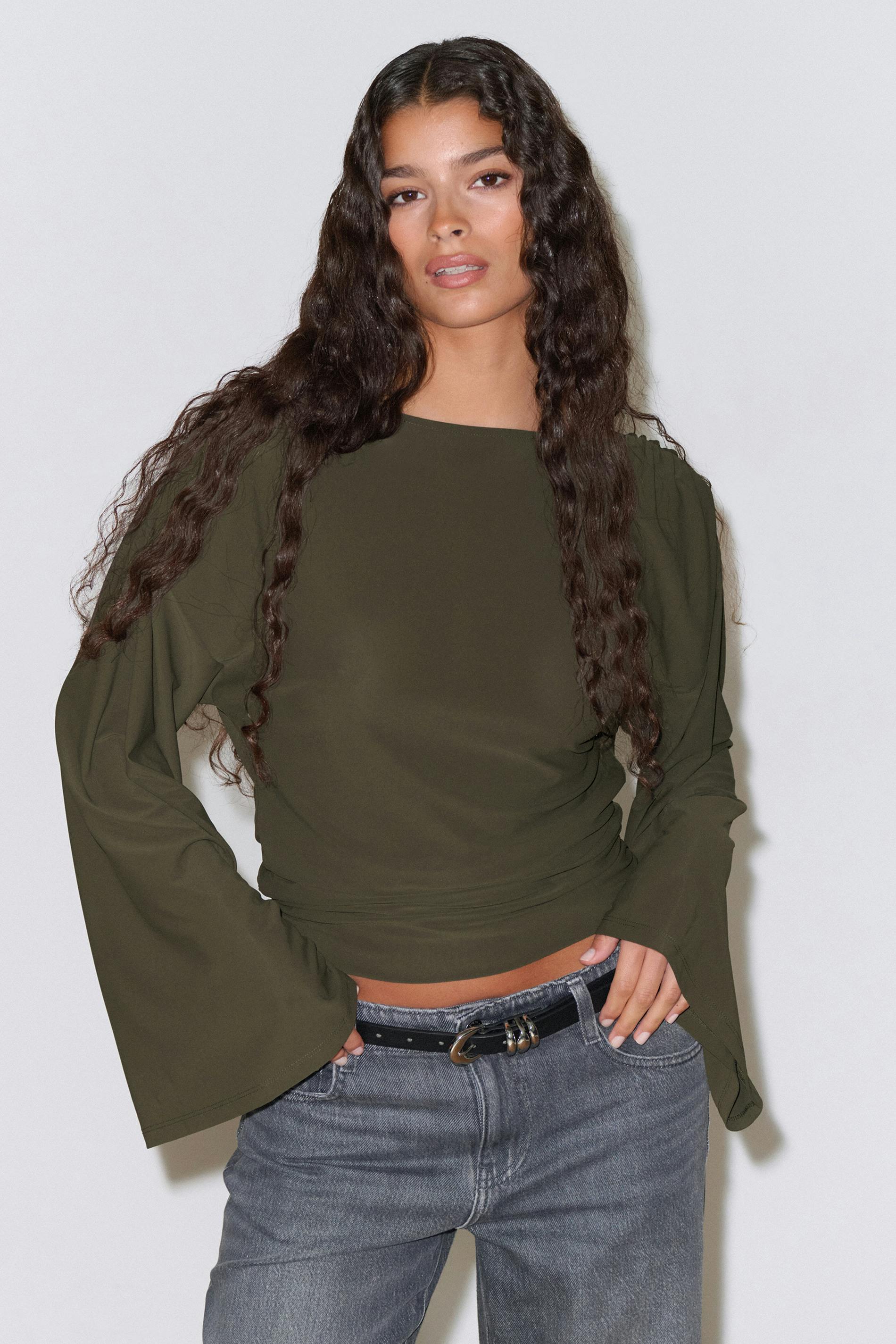 Topp med en lång, vid ärm. Toppen är mörkgrön och har en djup, draperad rygg. Den har rynkningar i sidorna, en båtringning och en normal passform.