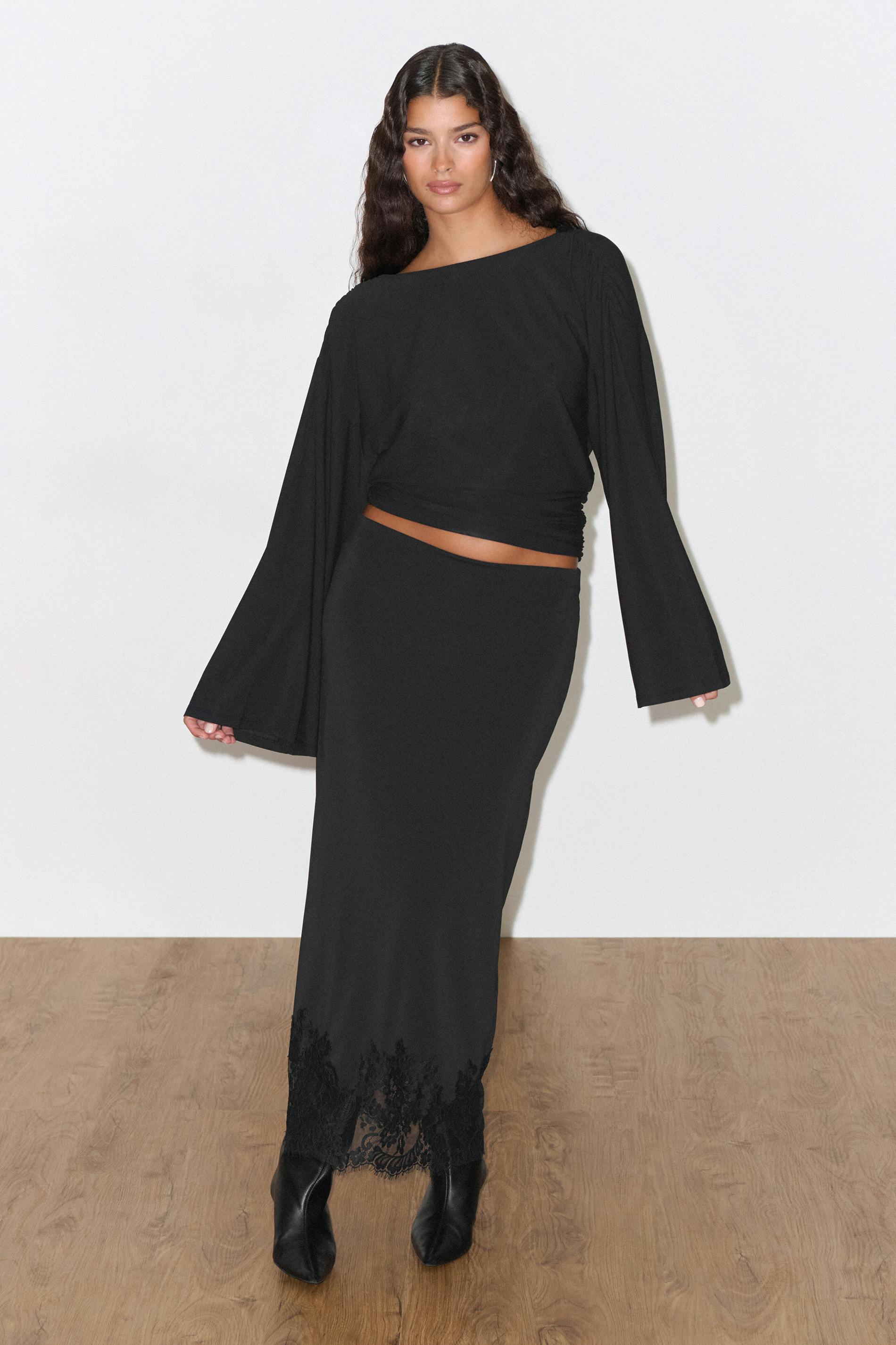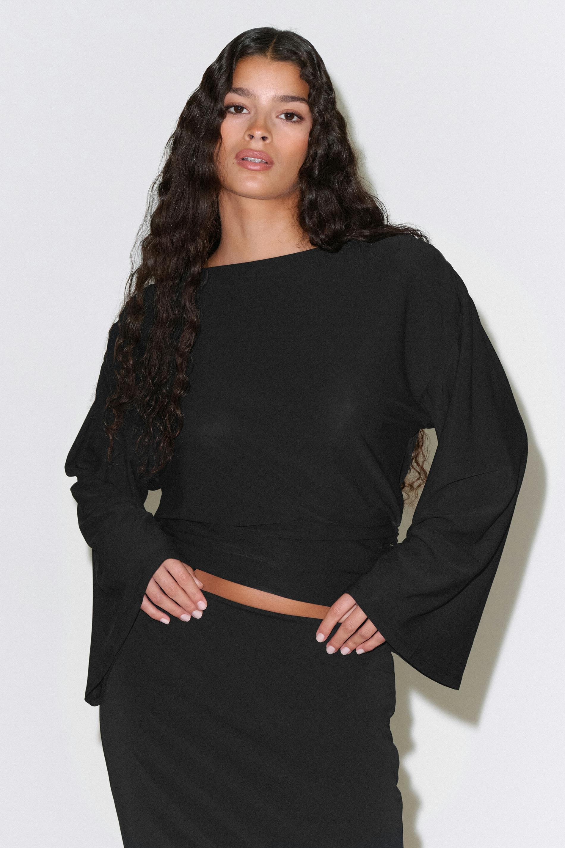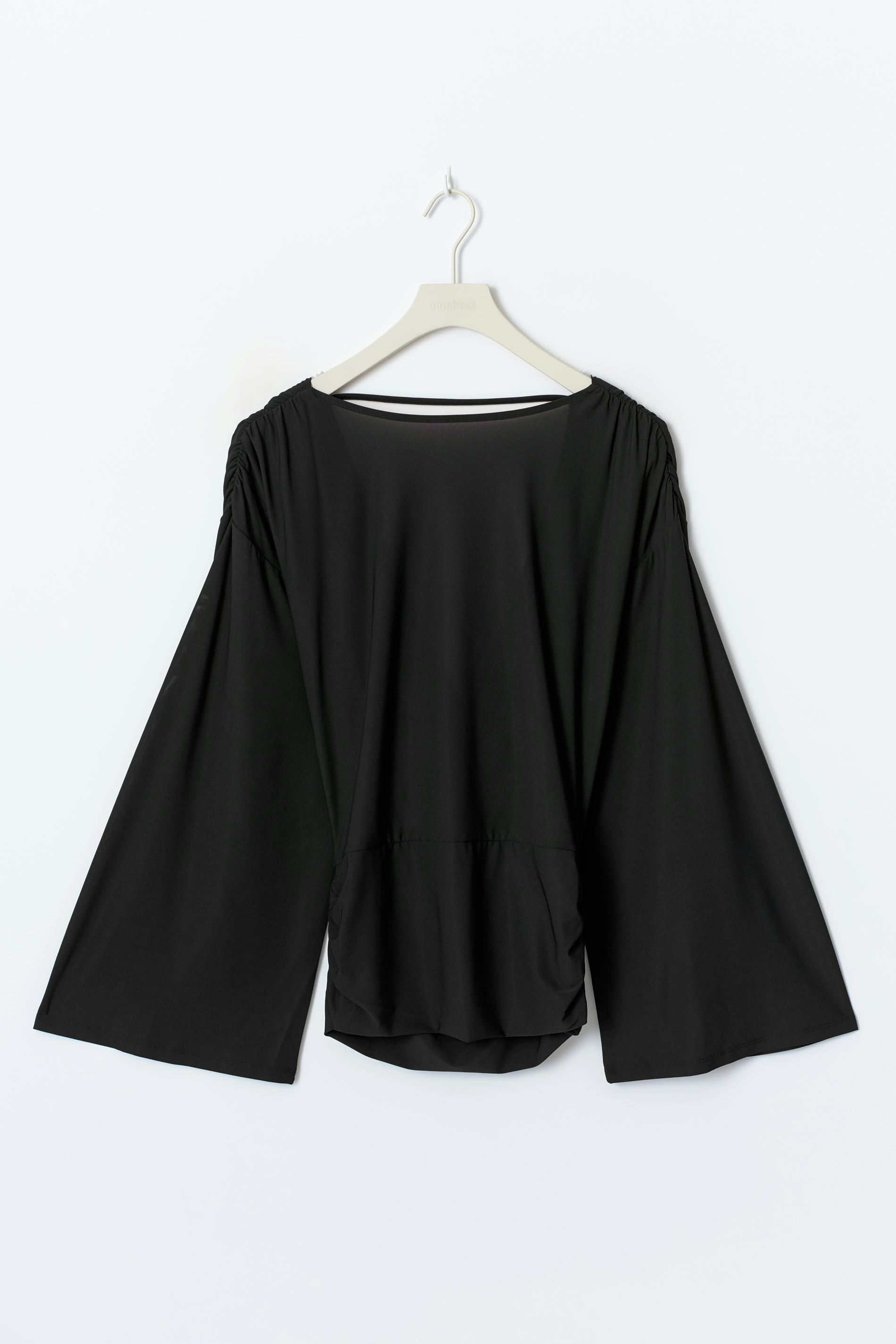 Topp med en lång, vid ärm. Toppen är svart och har en djup, draperad rygg. Den har rynkningar i sidorna, en båtringning och en normal passform.
