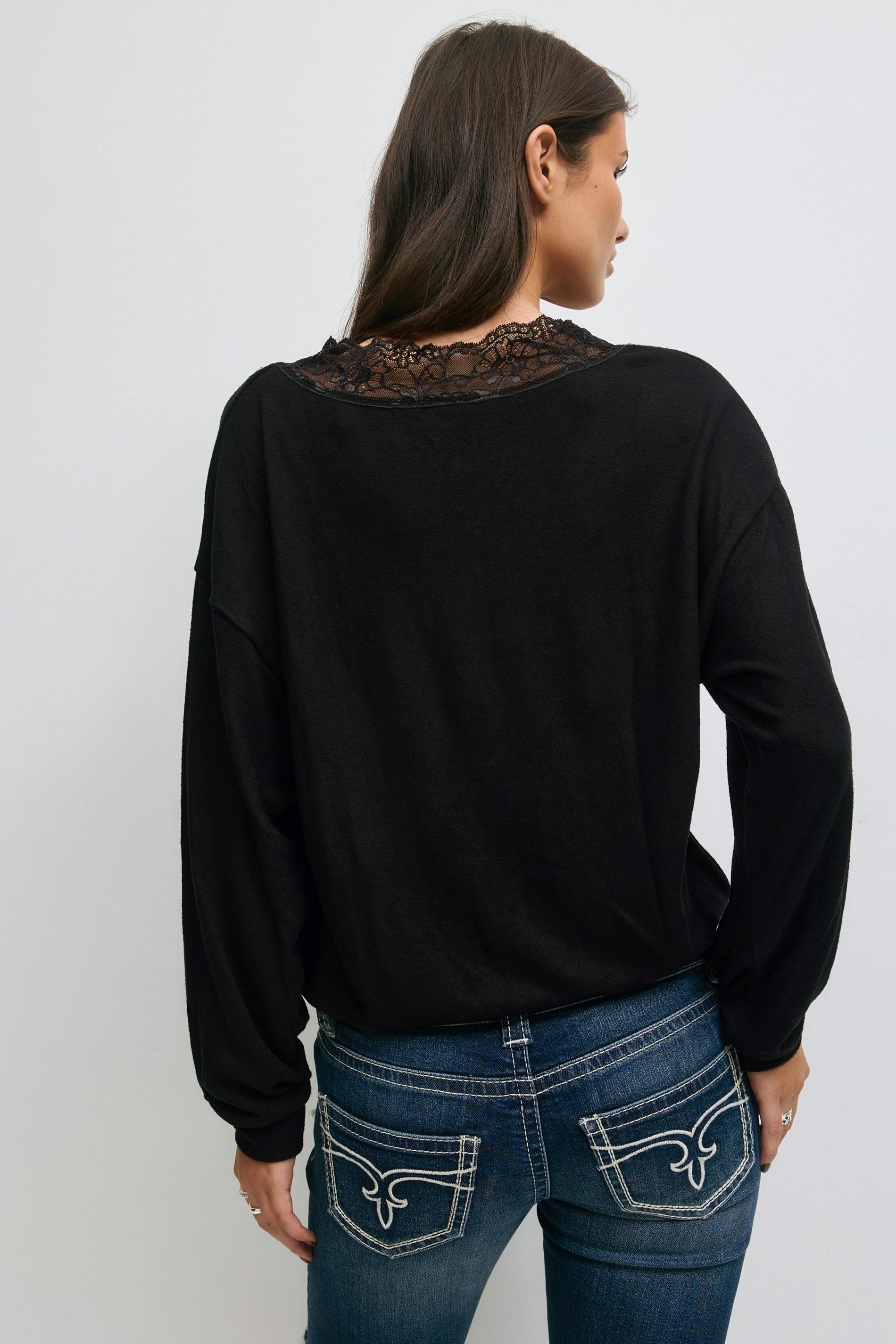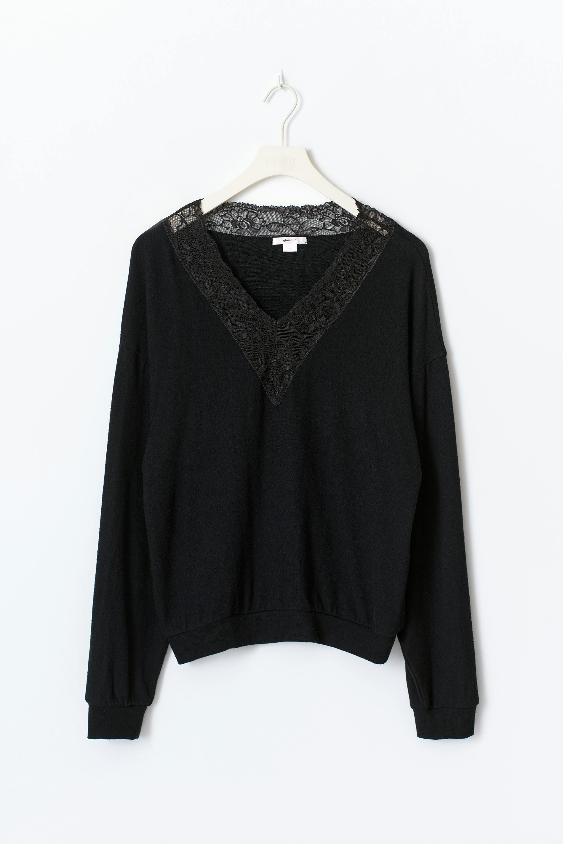 Sweatshirt med en lös passform. Sweatshirten är svart och har en v-ringning med spetsdetalj. Den har en lång ärm.