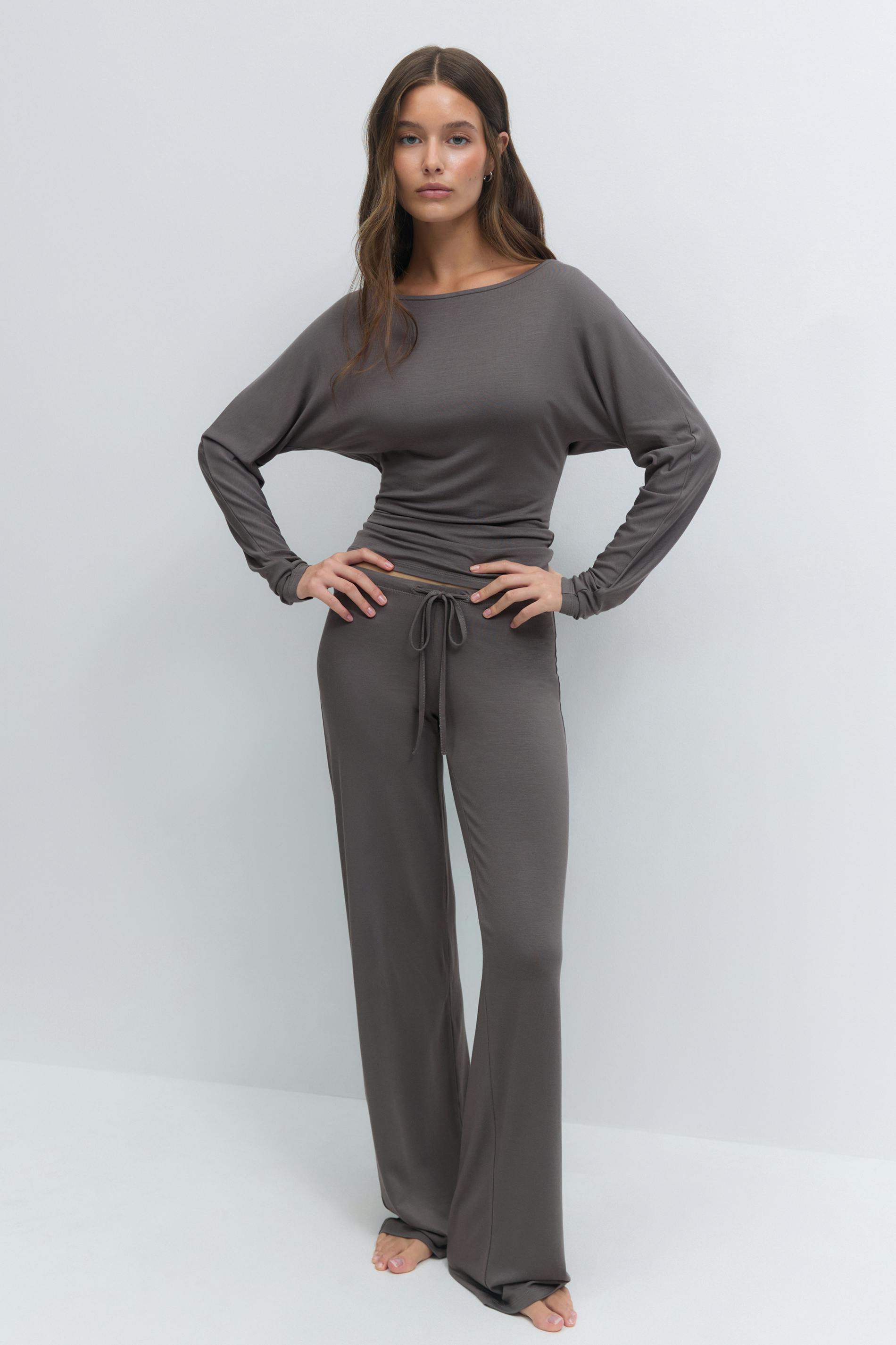 Långärmad pyjamastopp med båtringning. Toppen är grå och har mjuk kvalitet. Den har lös passform upptill och figurnära midja.