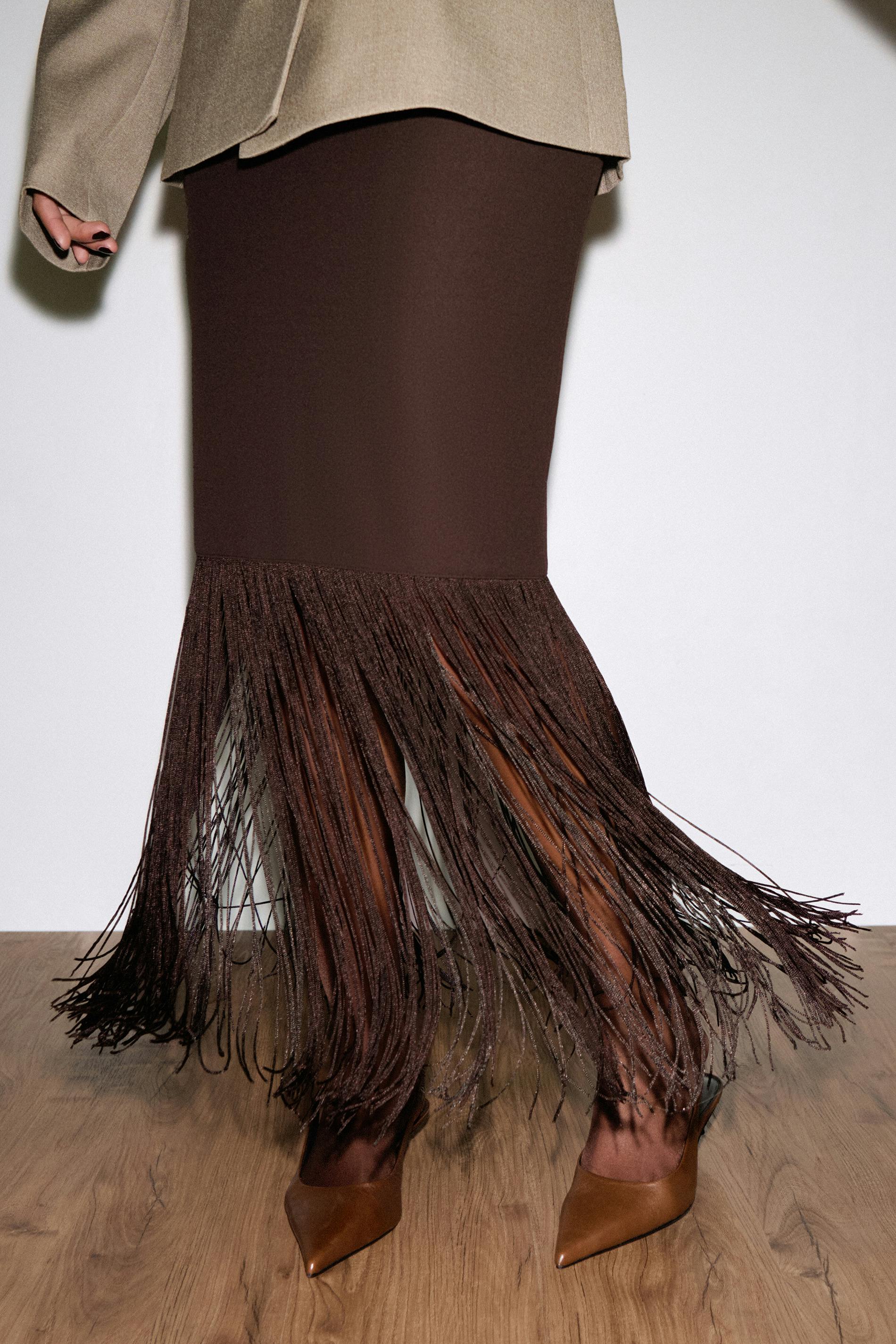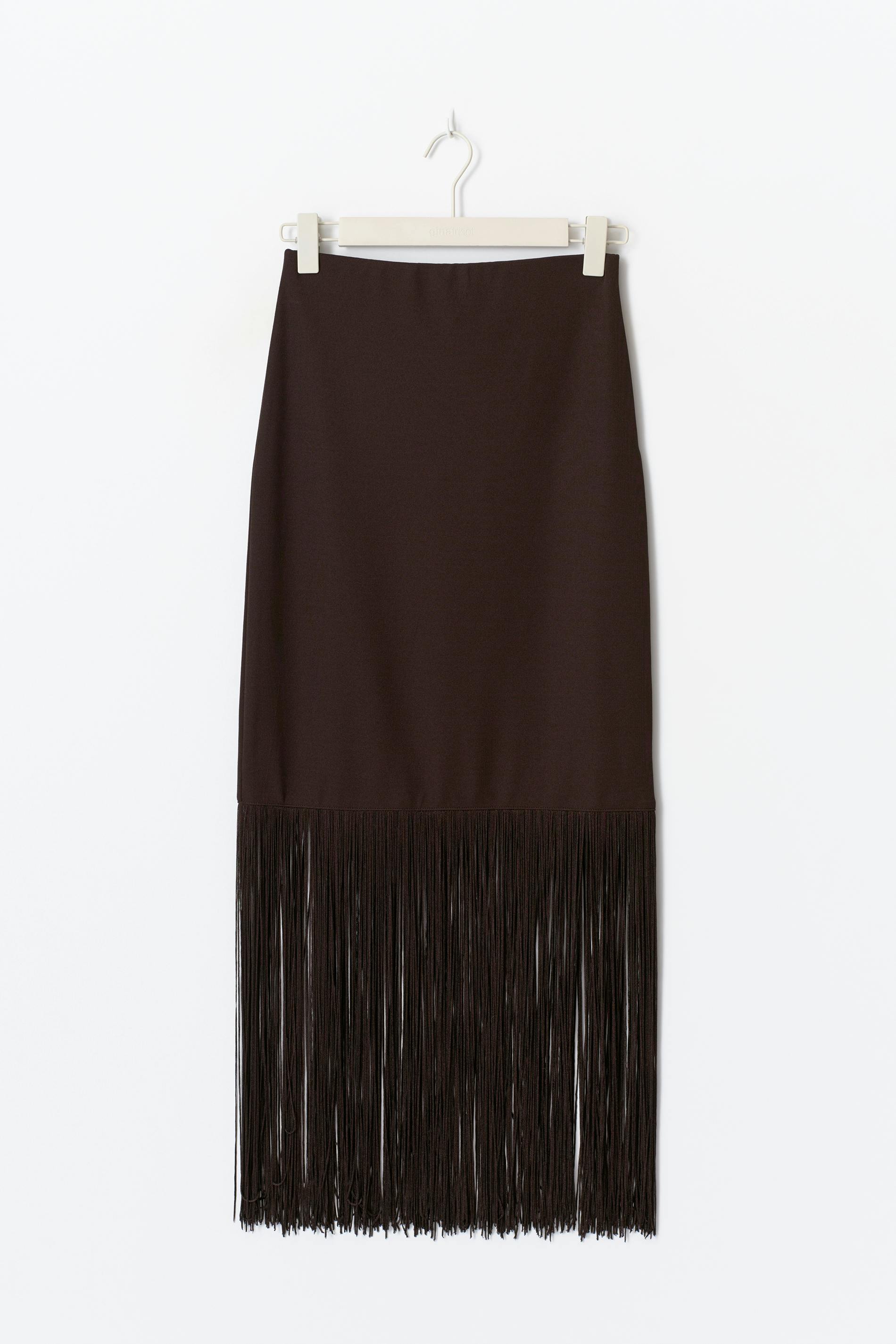 Maxikjol med långa fransar nedtill. Kjolen är brun och har en figurnära passform.
