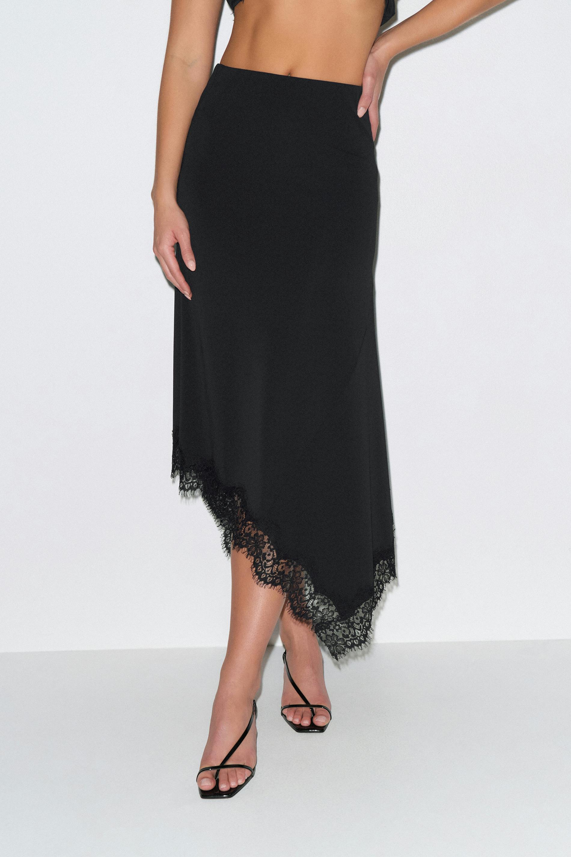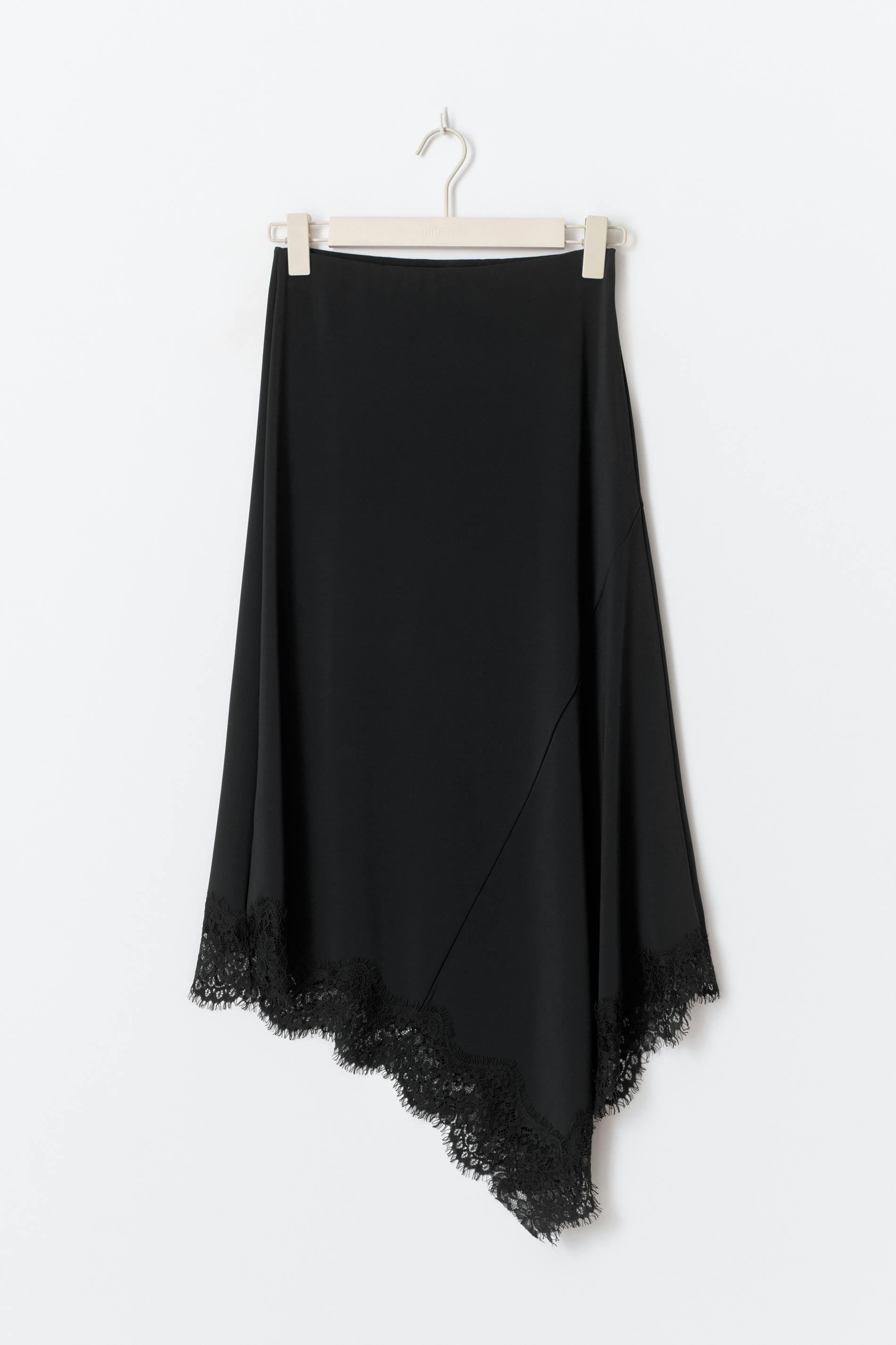 Midikjol med en asymmetrisk design. Kjolen är svart och har spets i nederkant. Den har en elastisk medelhög midja och en normal passform.