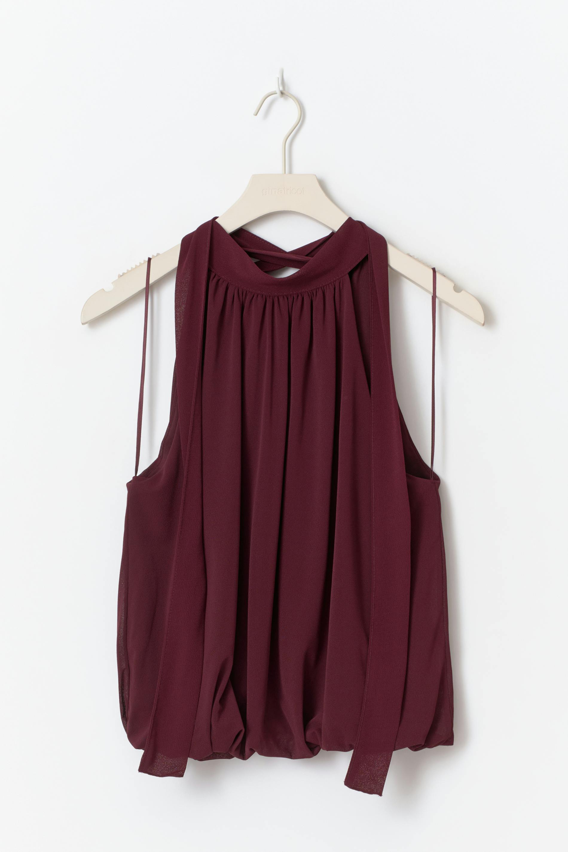 Halternecktopp med en ärmlös design. Toppen är vinröd och har ett knytband i nacken. Den har en lös passform.