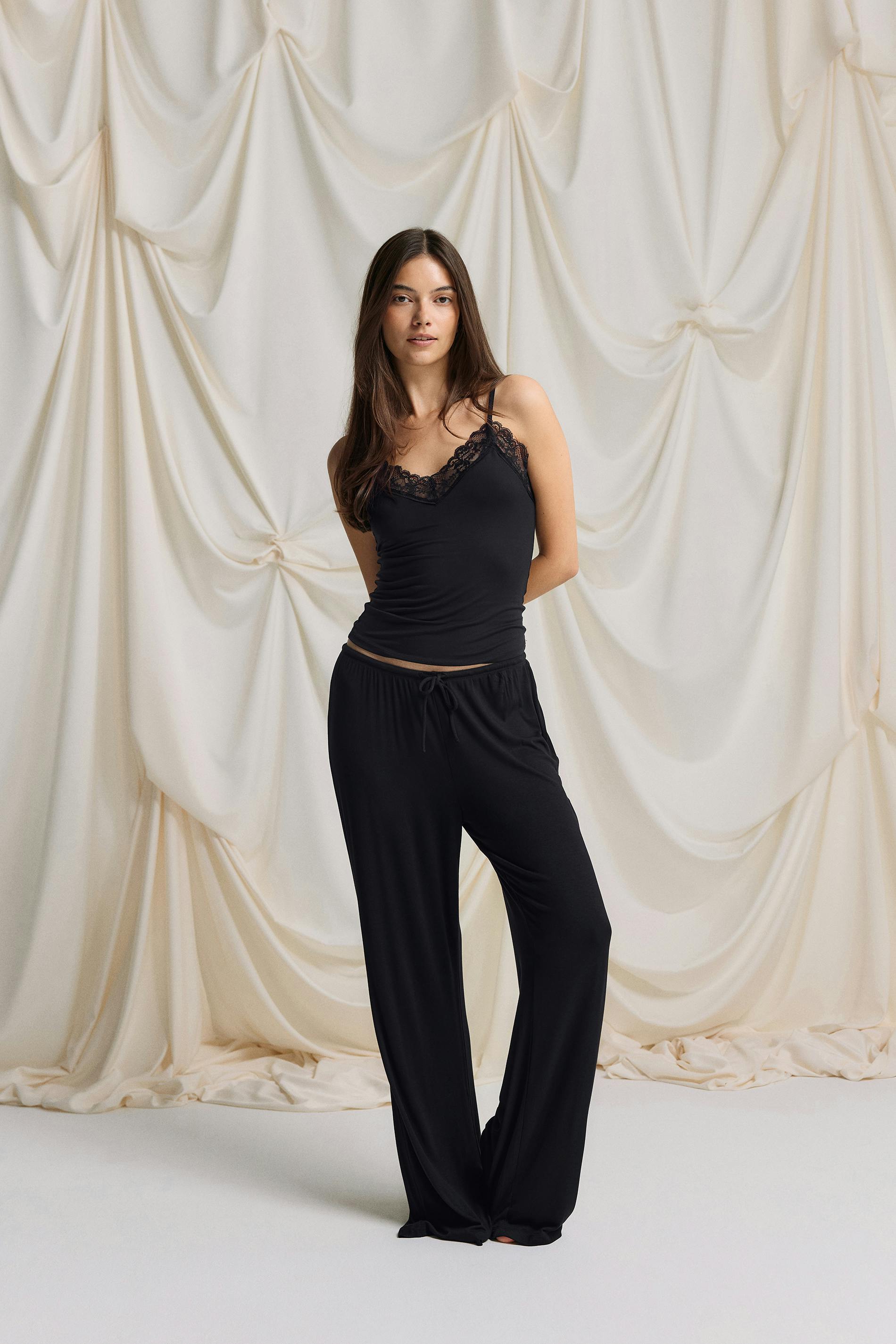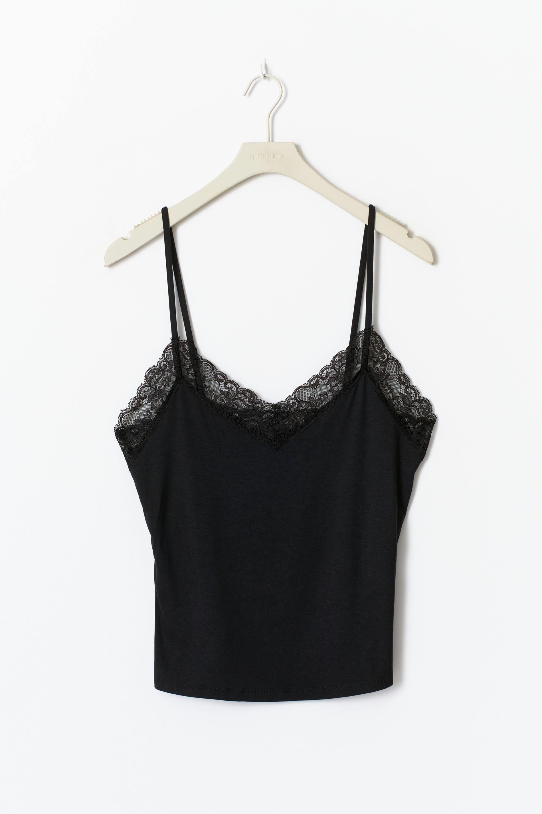 Croppat linne i modal med spets kring halsringning. Linnet är svart och har reglerbara axelband. Det har mjukt material, v-ringning och normal passform.