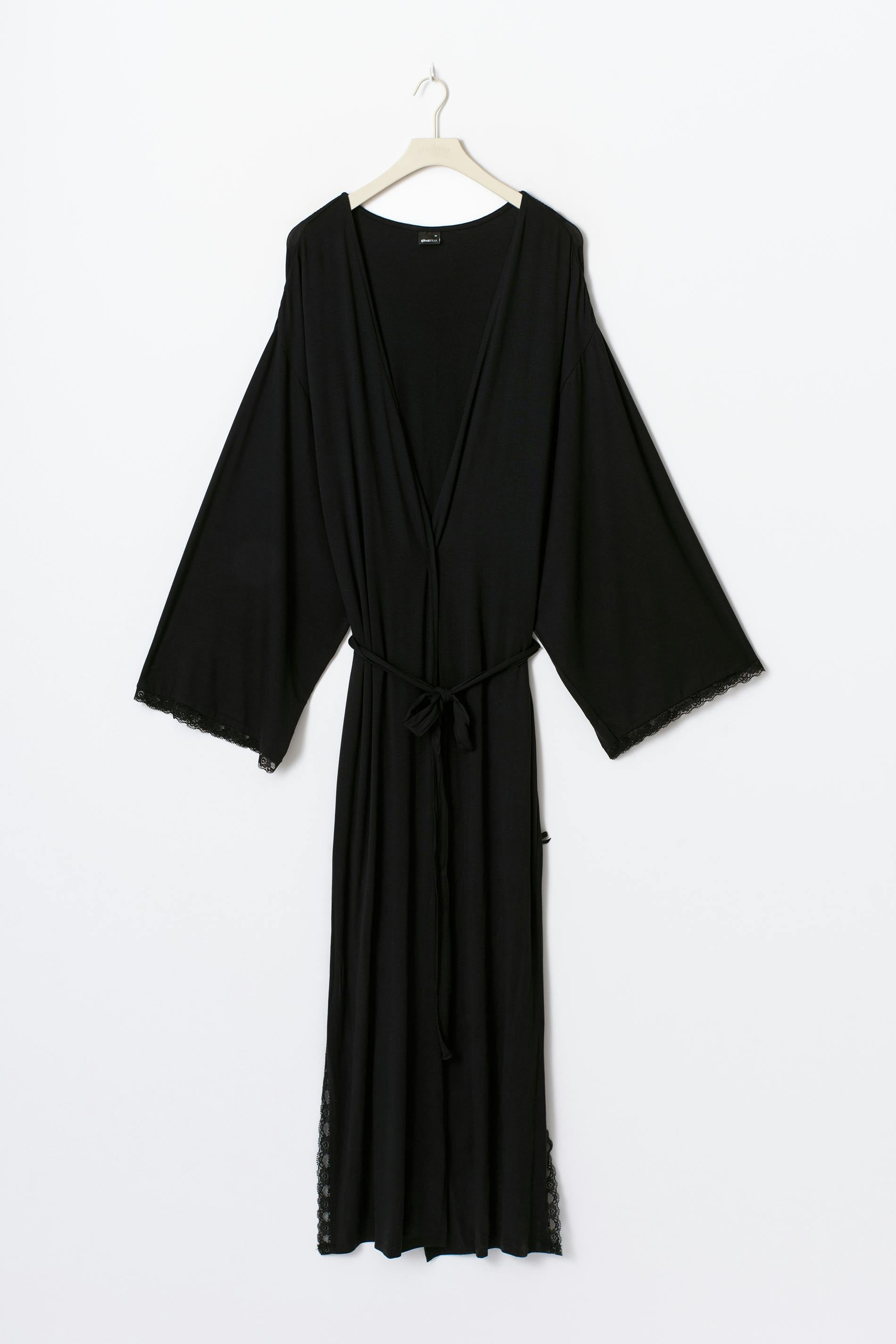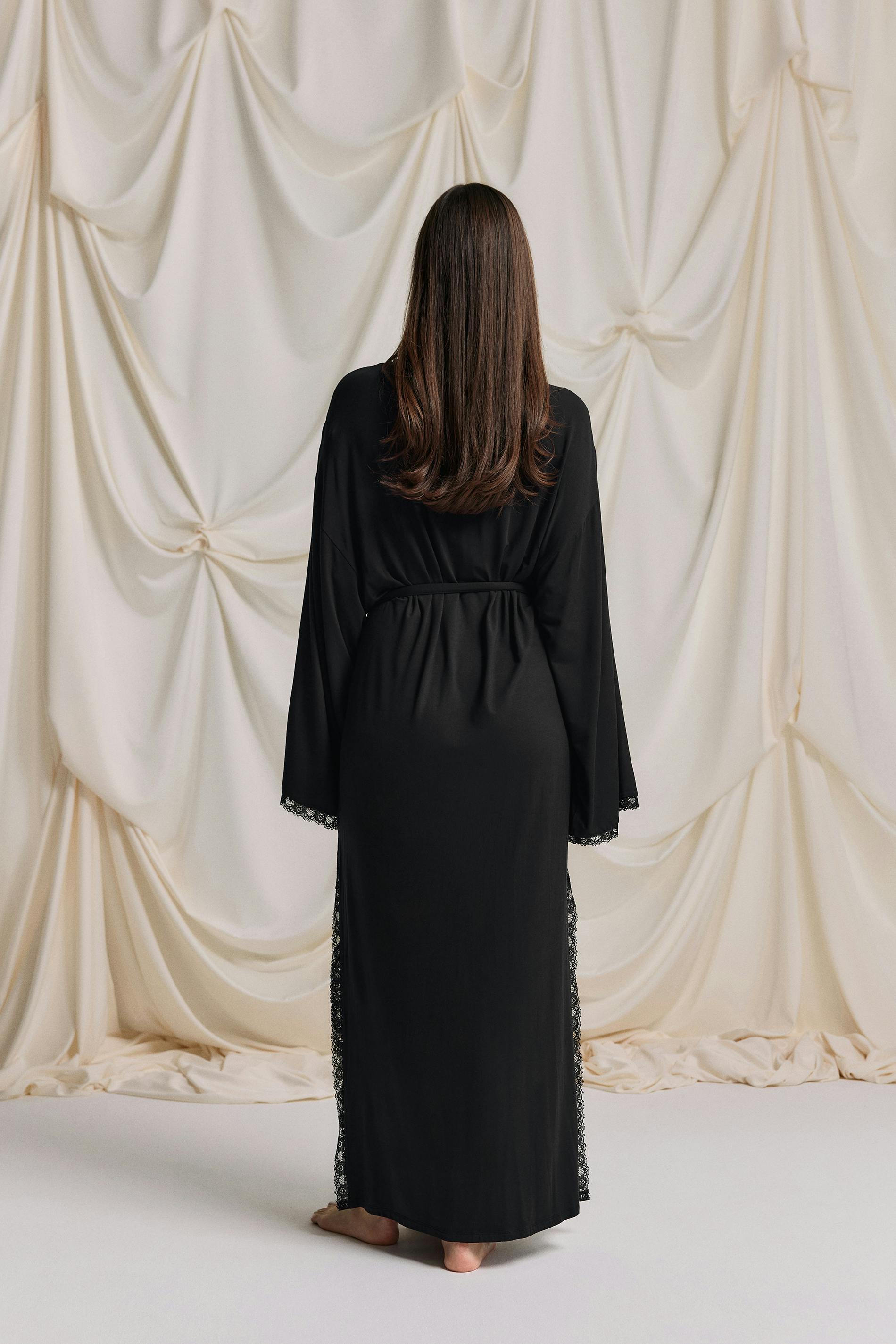 Lång morgonrock i modal med spetsdetaljer. Morgonrocken är svart och har knytbälte i midjan. Den har långa ärmar, mjukt material, slits i sidorna och oversize fit.