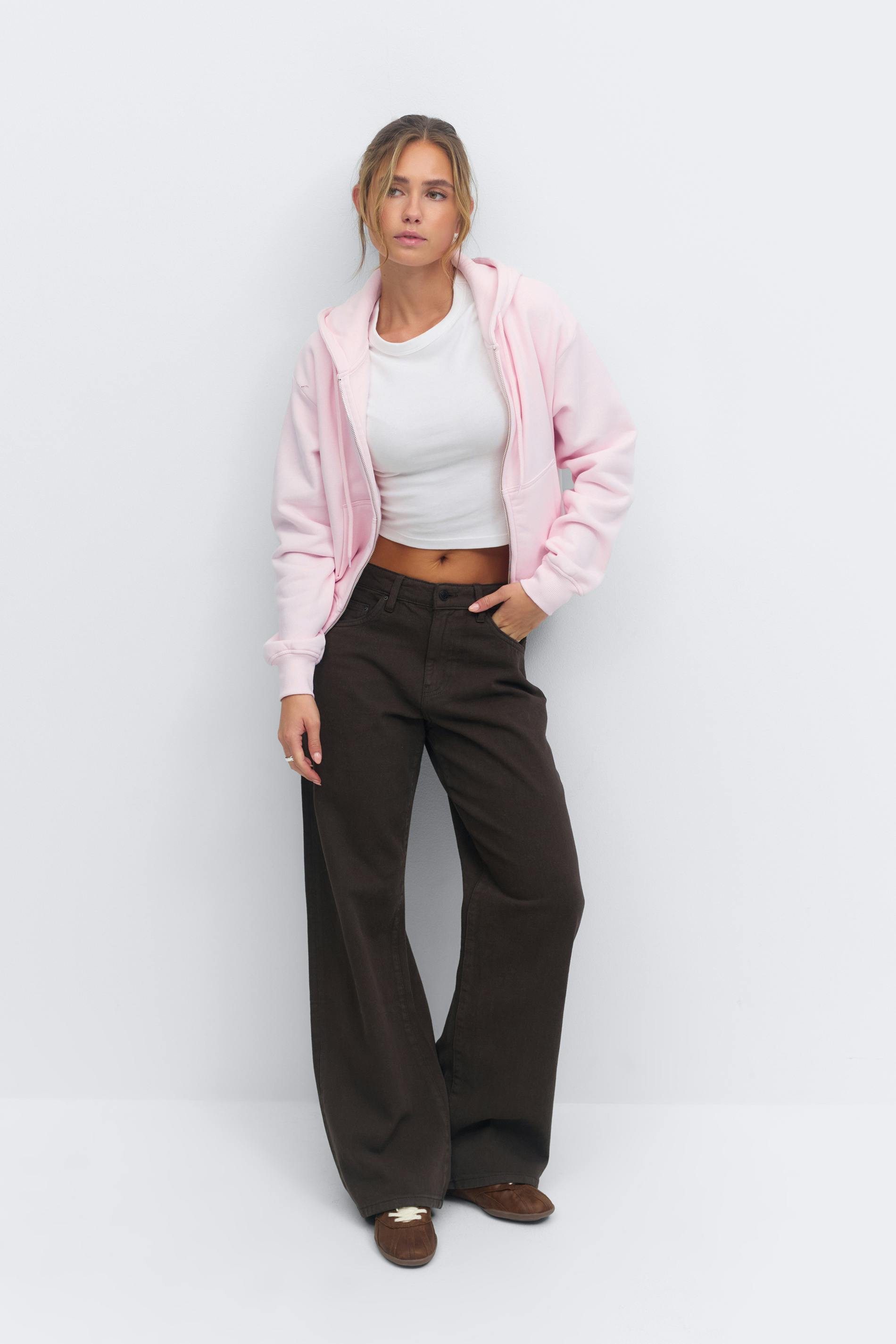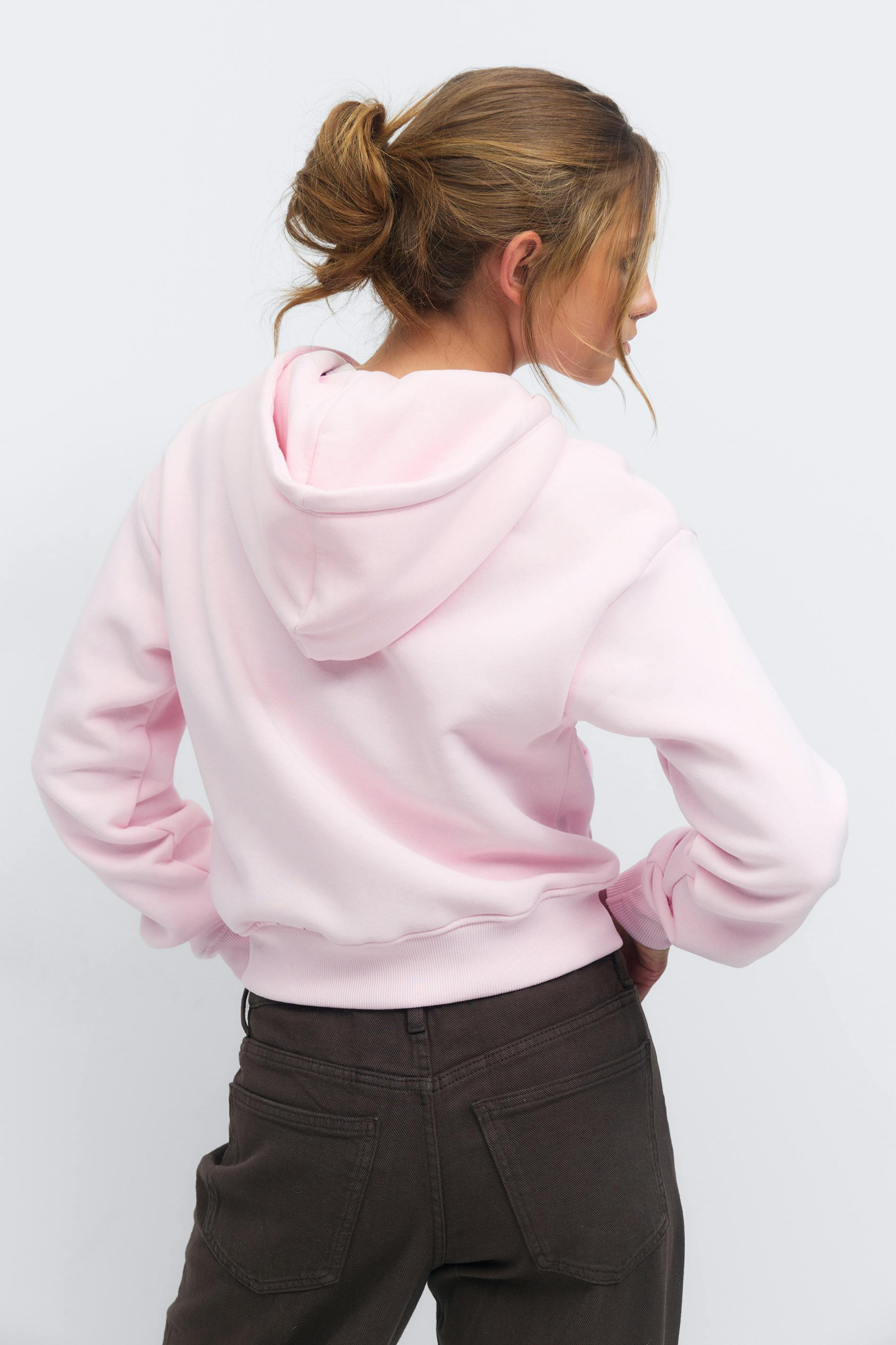 Munkjacka med en dragkedja framtill. Jackan är ljusrosa och har fickor i sidan. Den har en huva, en rund halsringning, kort längd och en ribbad mudd vid ärmslut och i nederkant.