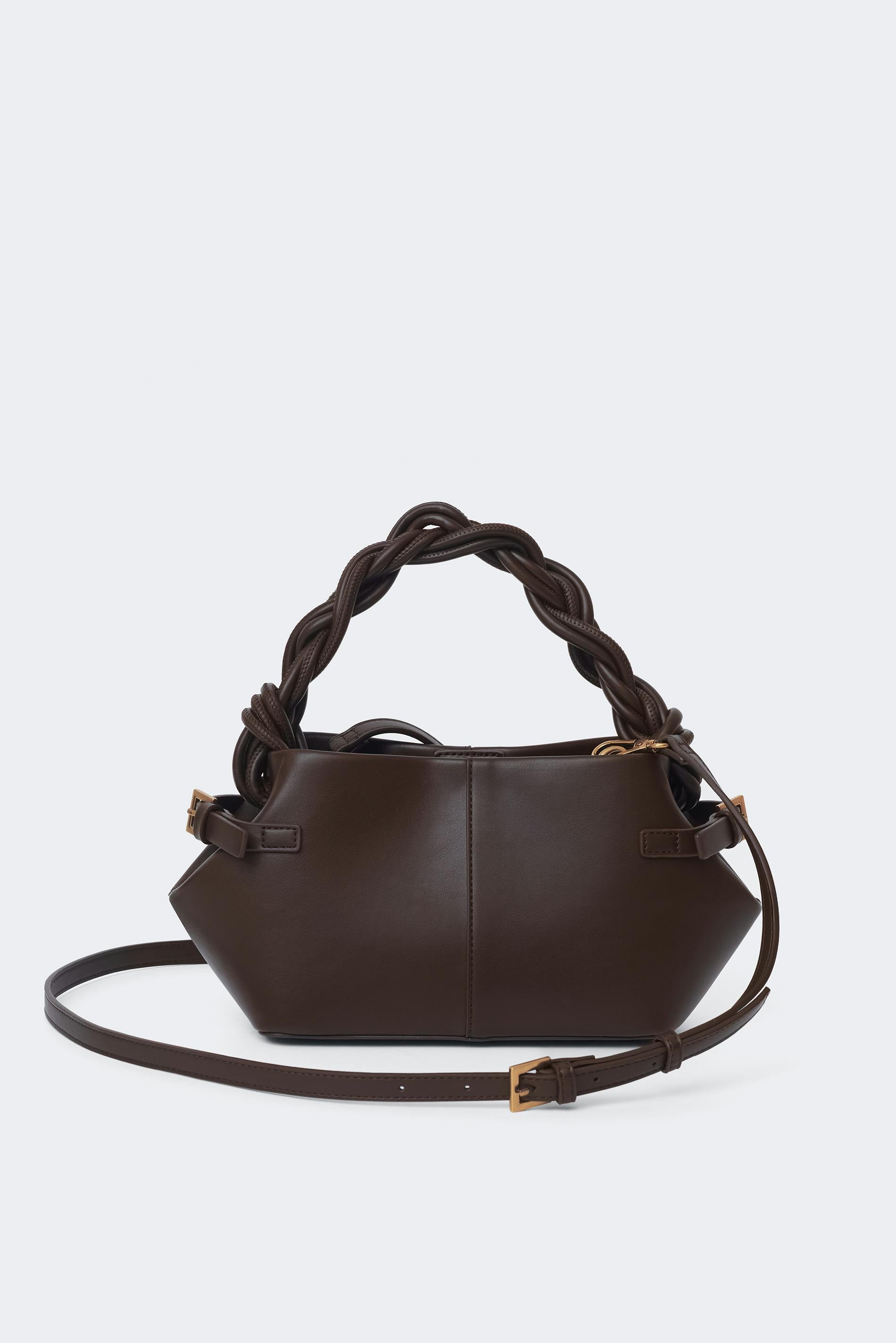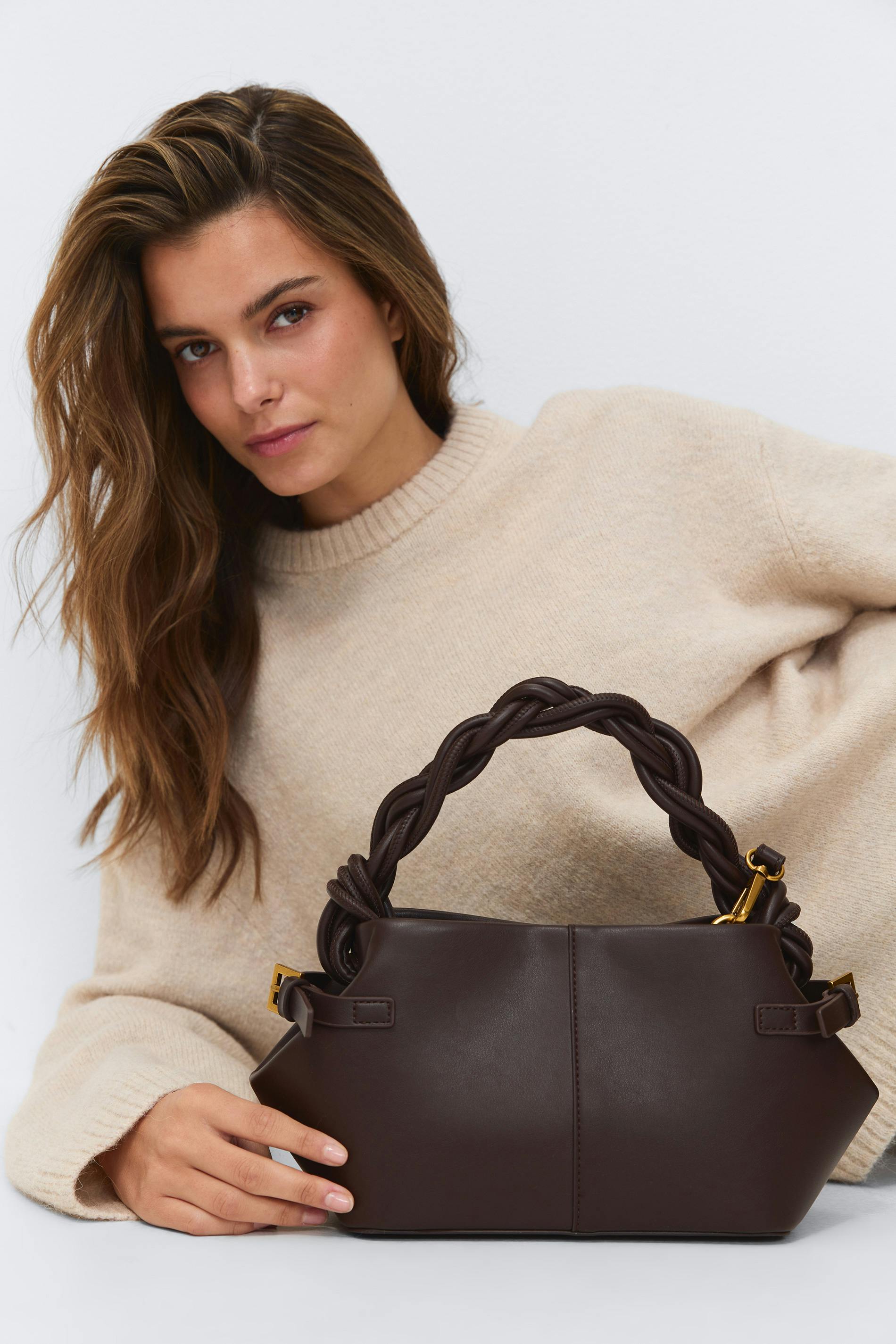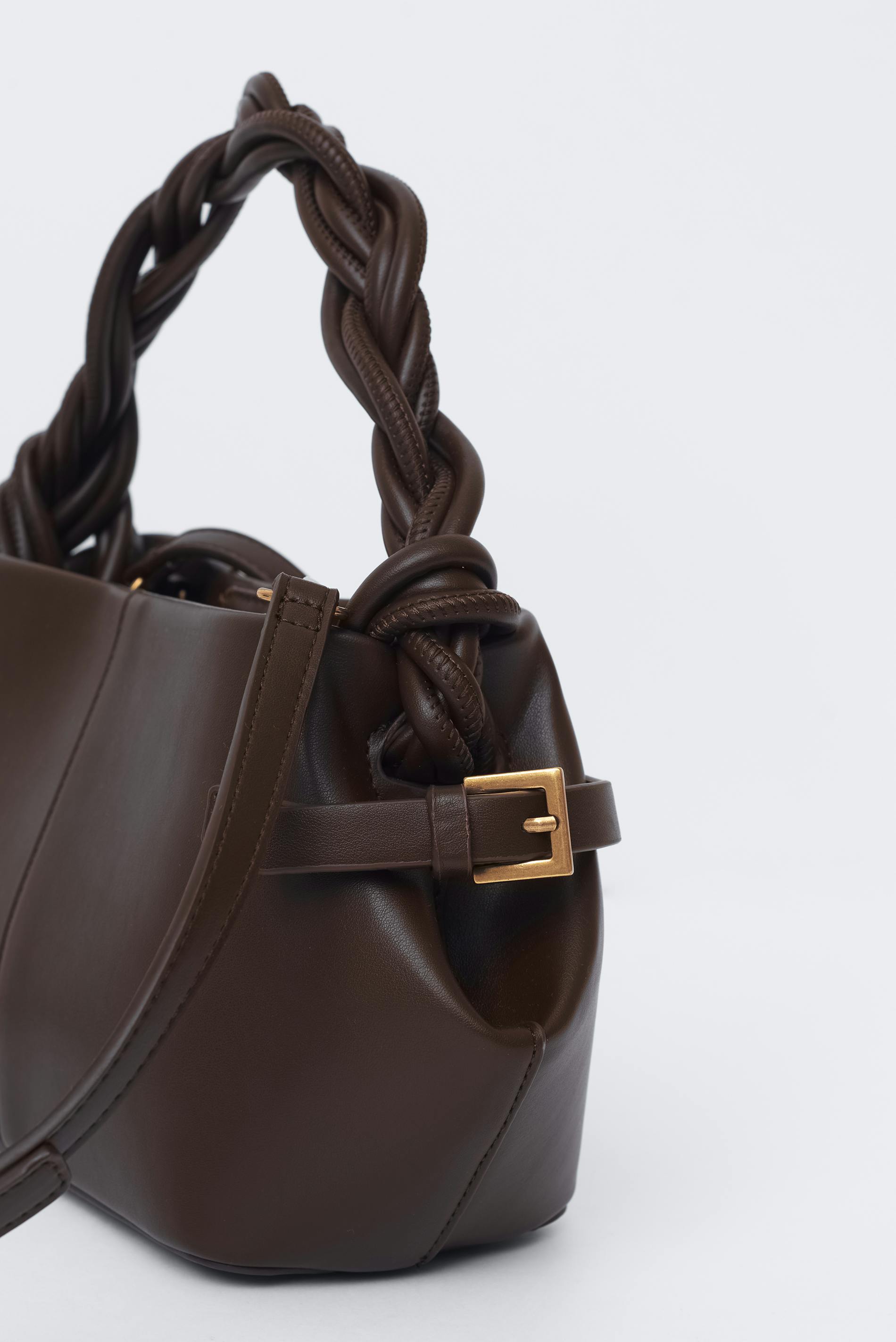 Liten handväska i läderimitation med flätat handtag. Väskan är brun och har ett avtagbart axelband med guldfärgade hakar. Den har bältdetalj i sidorna, gulddetaljer och magnetknäppning.
