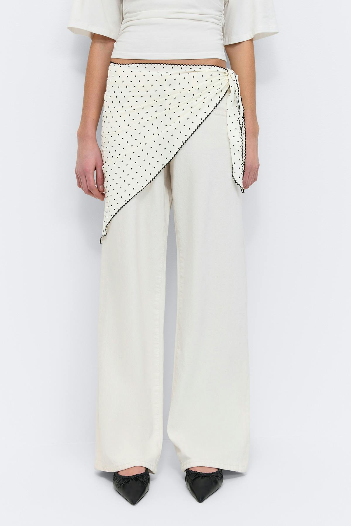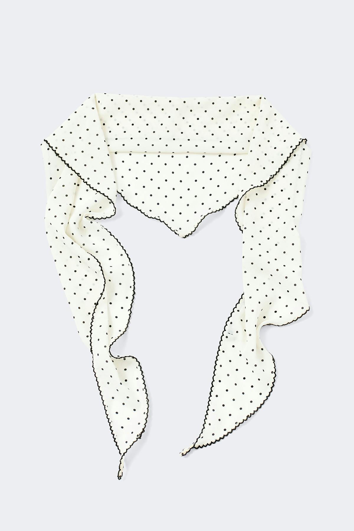 Prickig scarf med söm utmed kanterna. Scarfen är vit och svart.