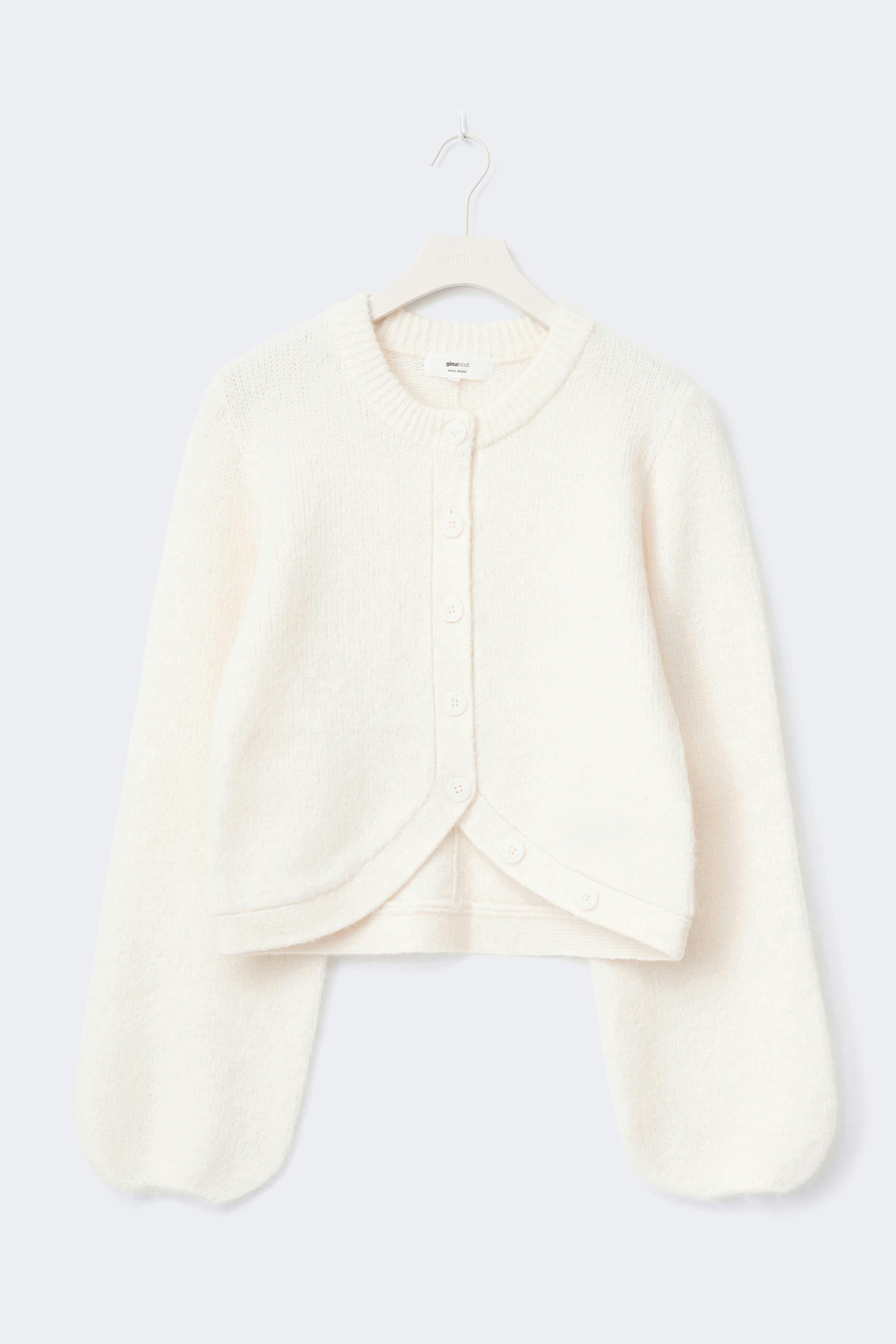Stickad kofta med långa ballongärmar. Koftan är vit och har knäppning framtill. Den har rund halsringning.