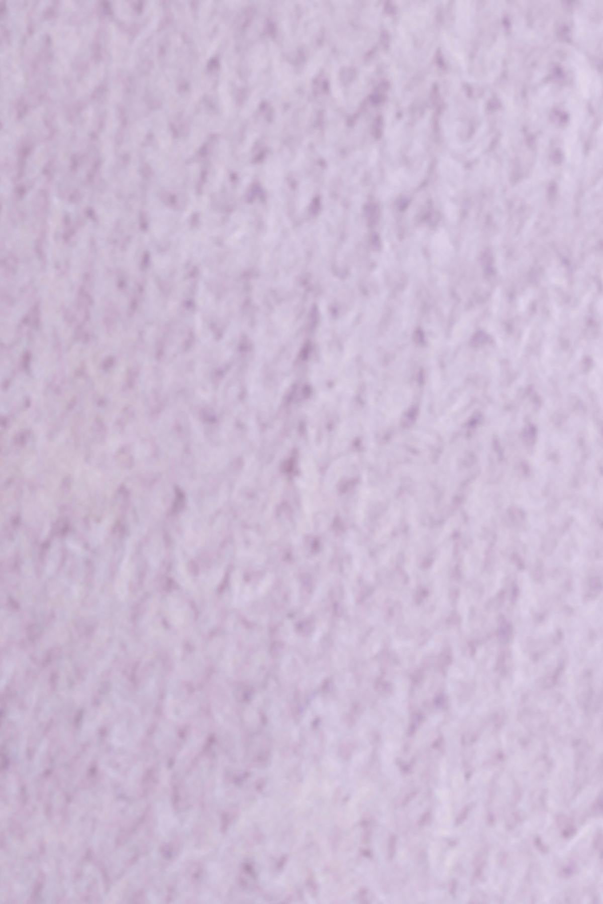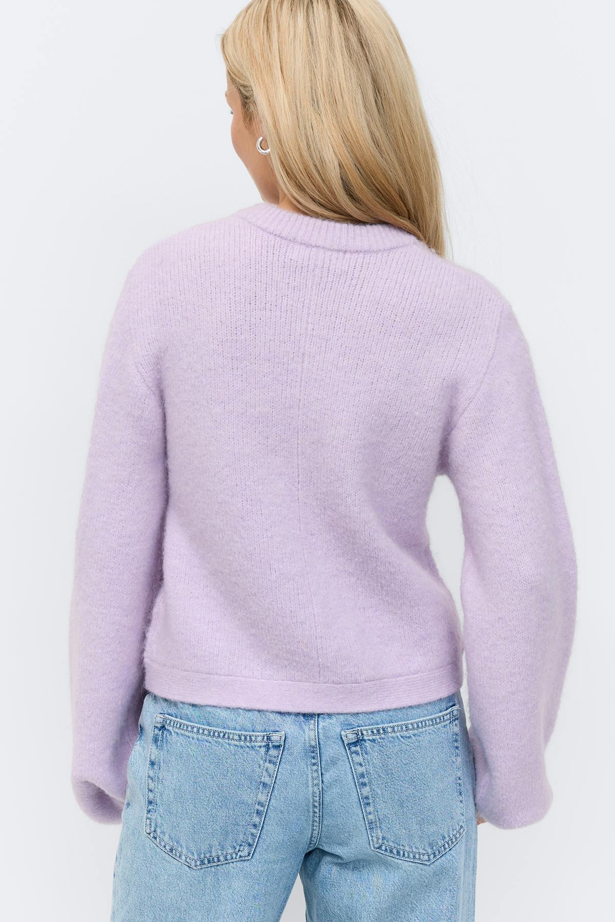 Stickad kofta med långa ballongärmar. Koftan är lila och har knäppning framtill. Den har rund halsringning.