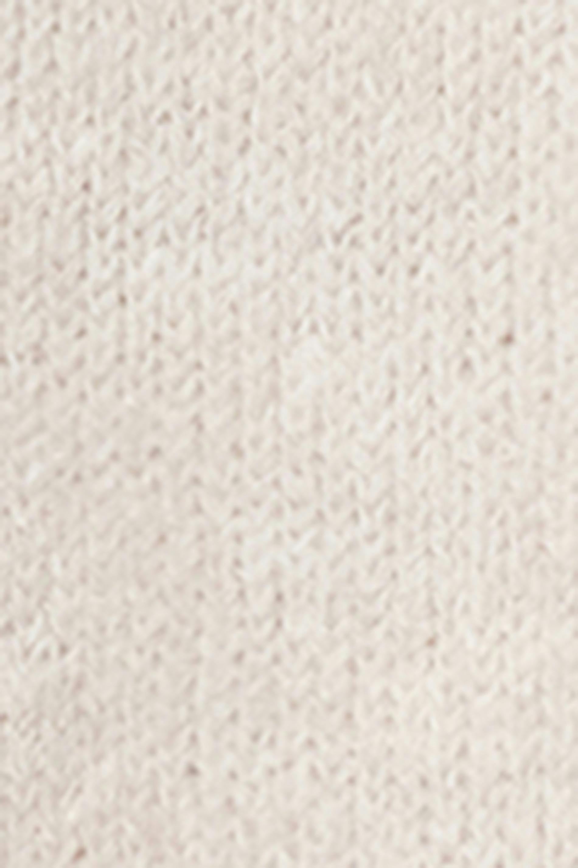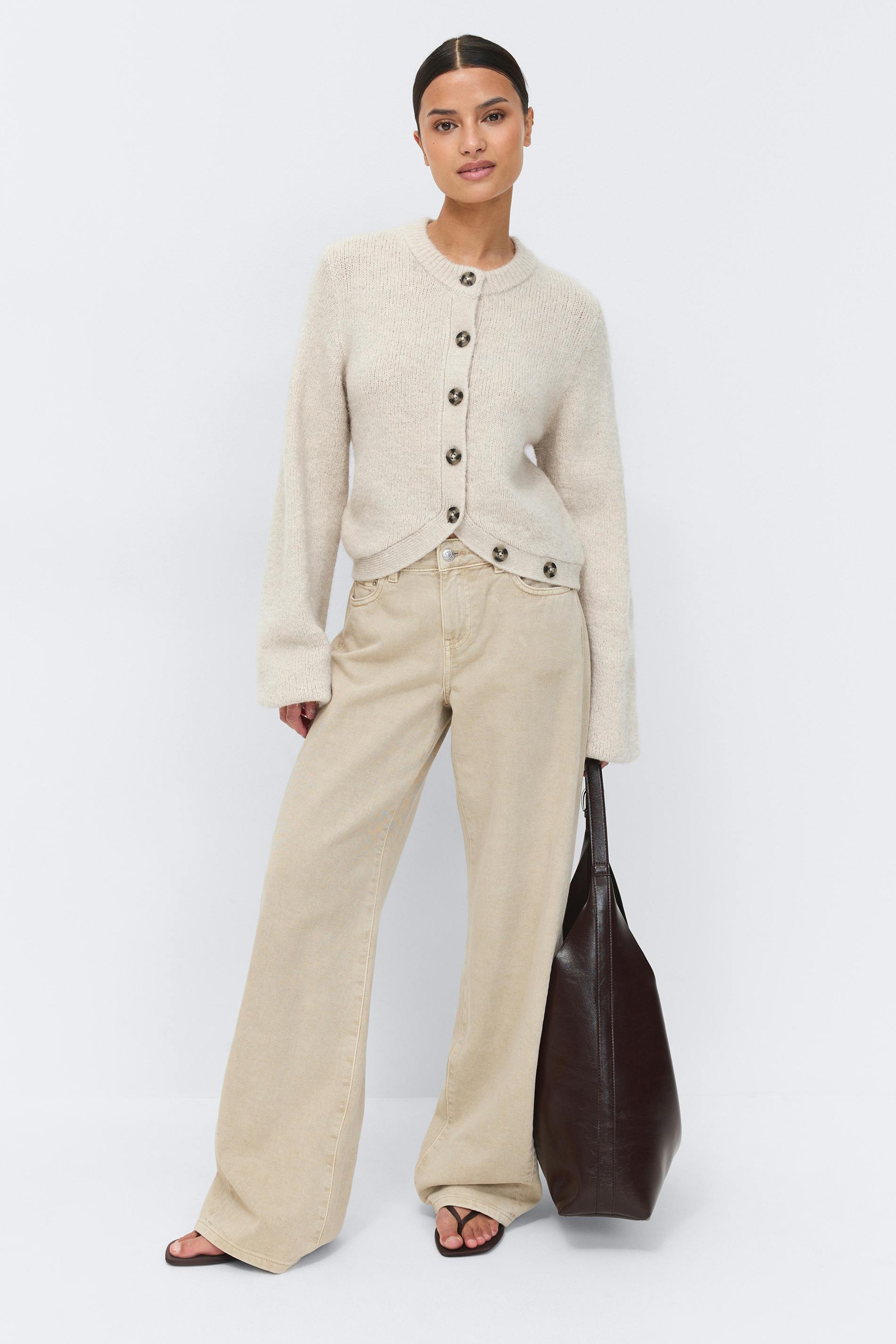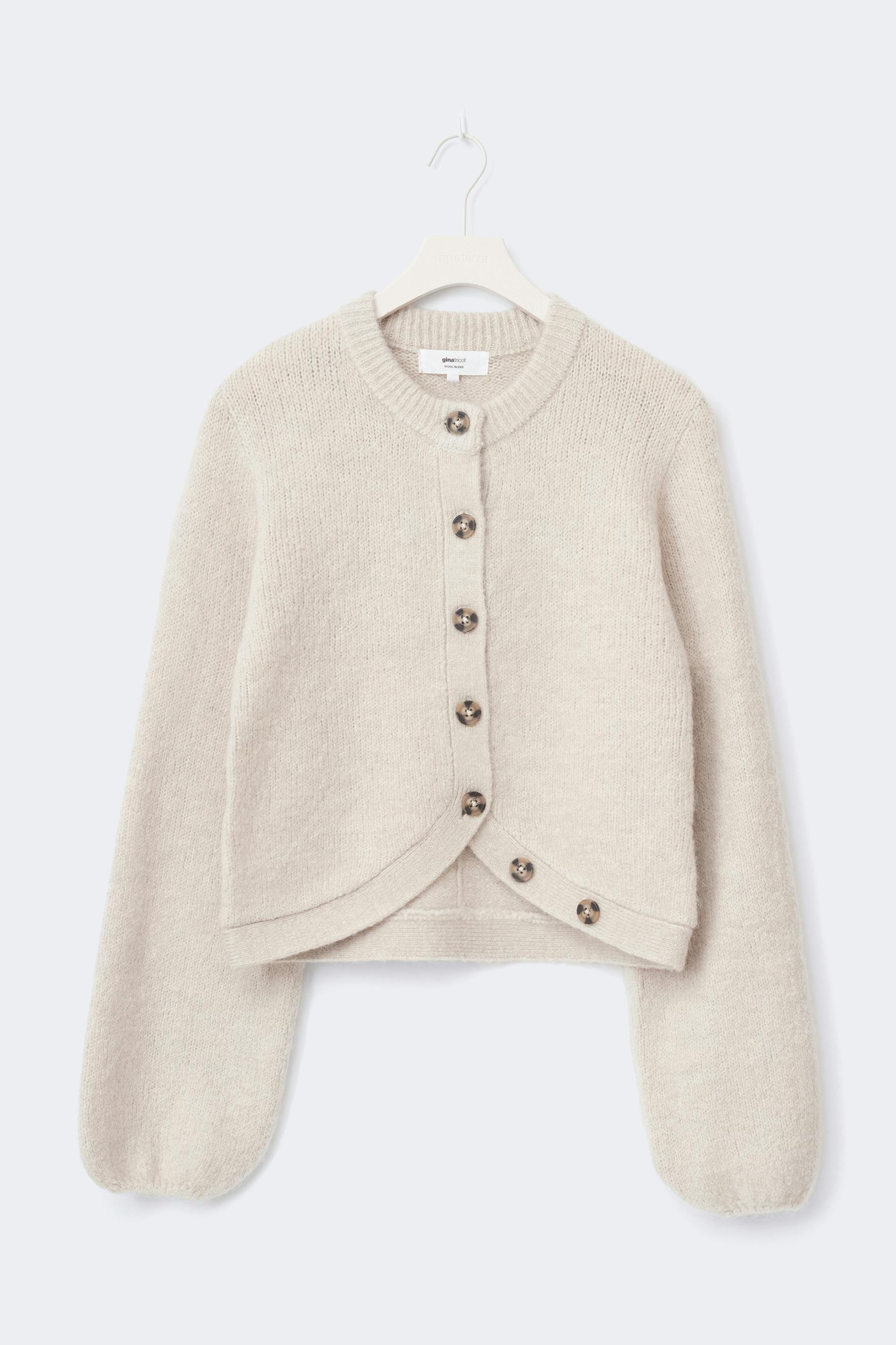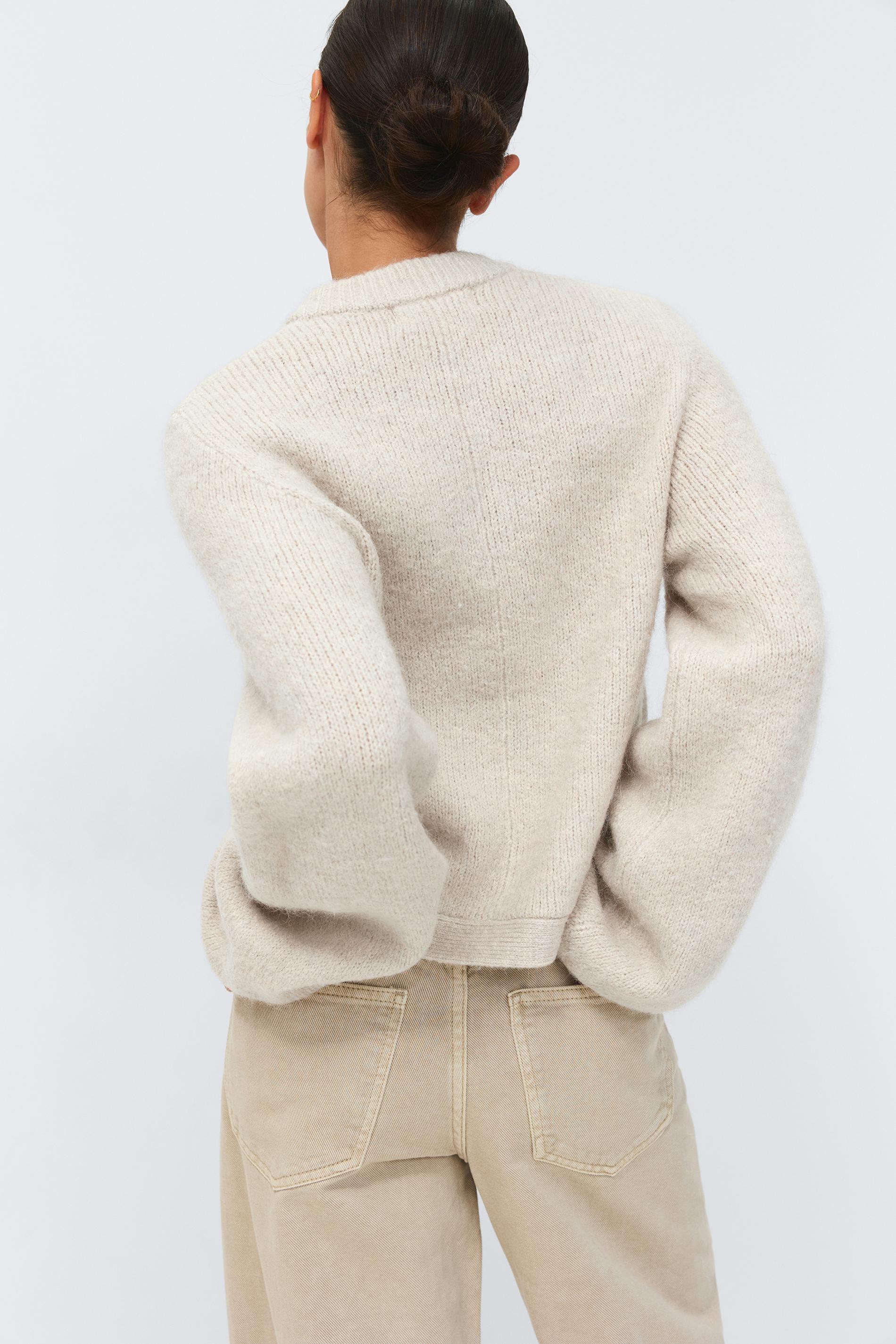 Stickad kofta med långa ballongärmar. Koftan är beige och har knäppning framtill. Den har rund halsringning.