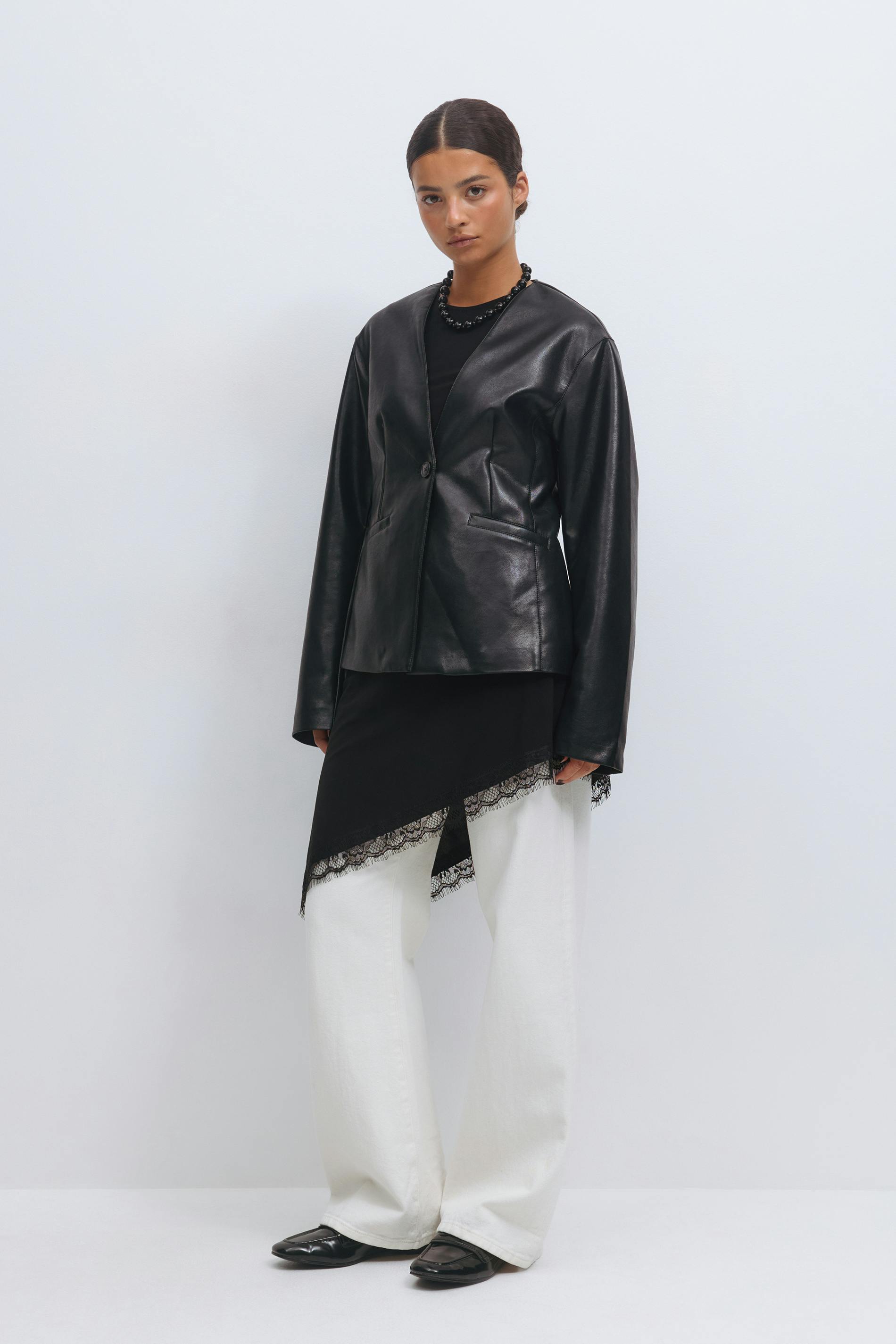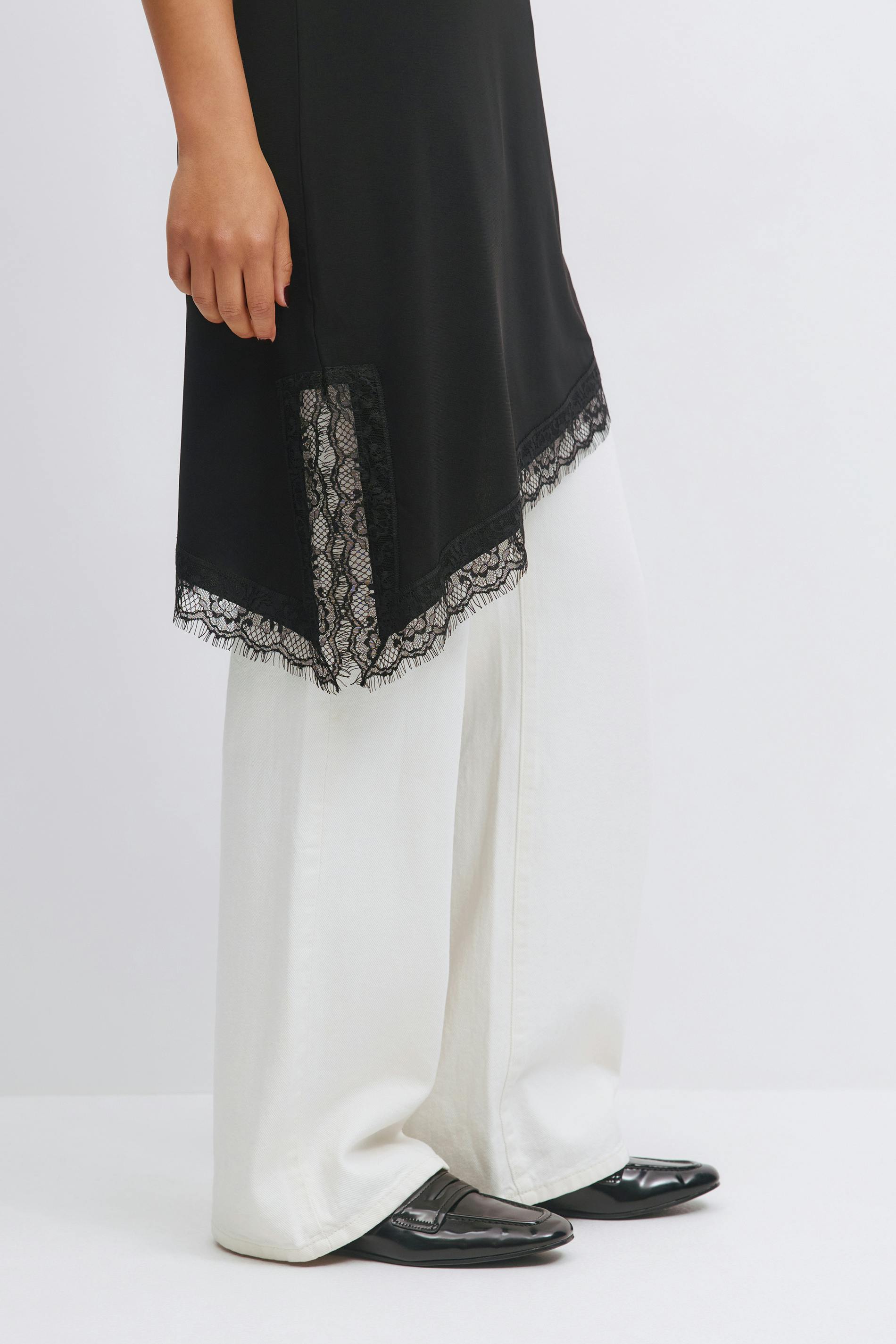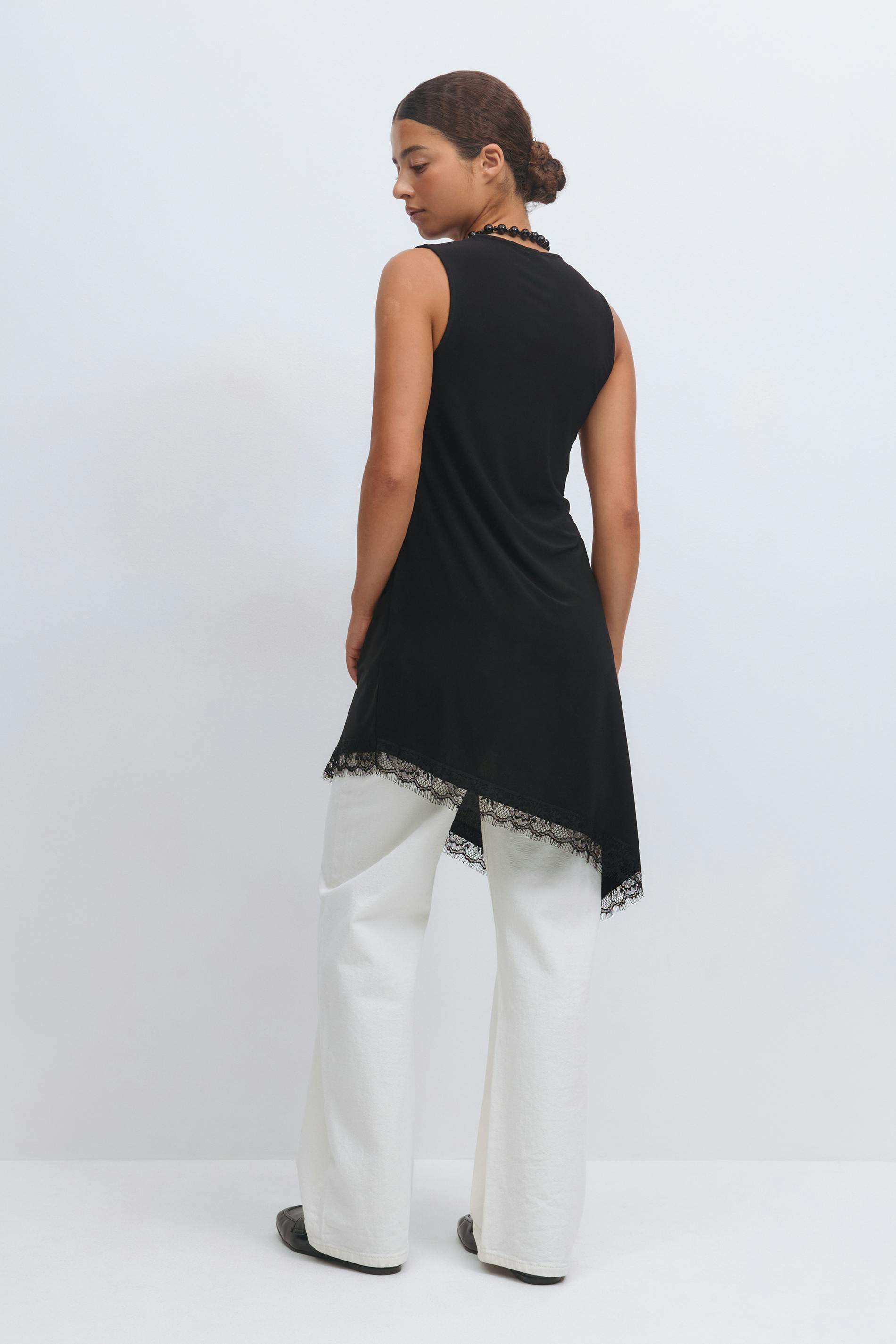 Ärmlös klänning med spets nedtill. Klänningen är svart och har asymmetrisk nederkant. Den har normal passform och rund halsringning.