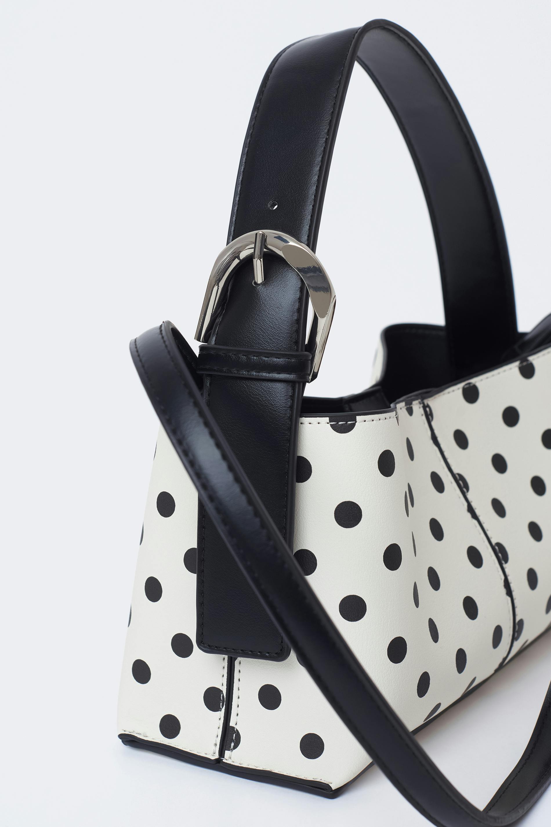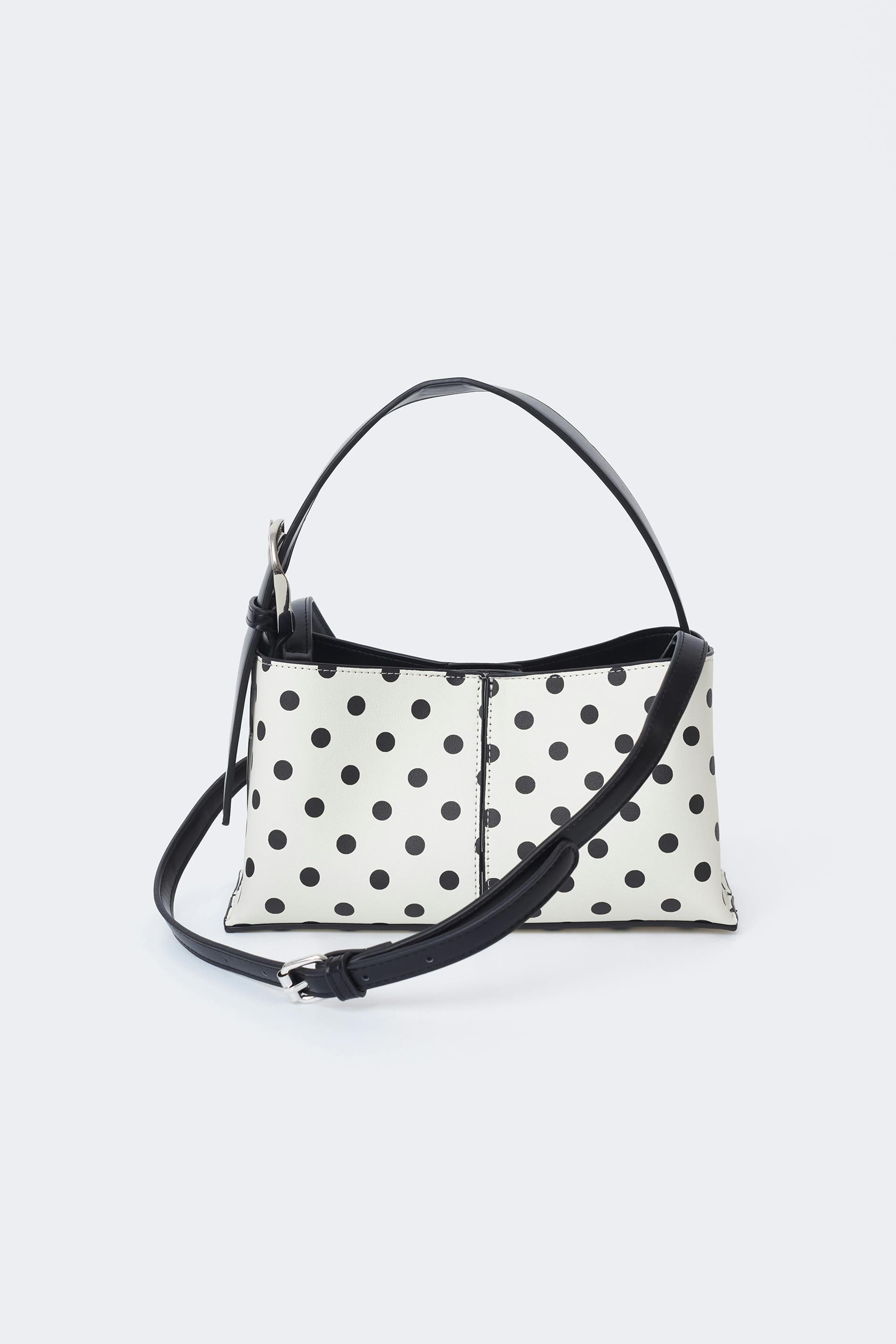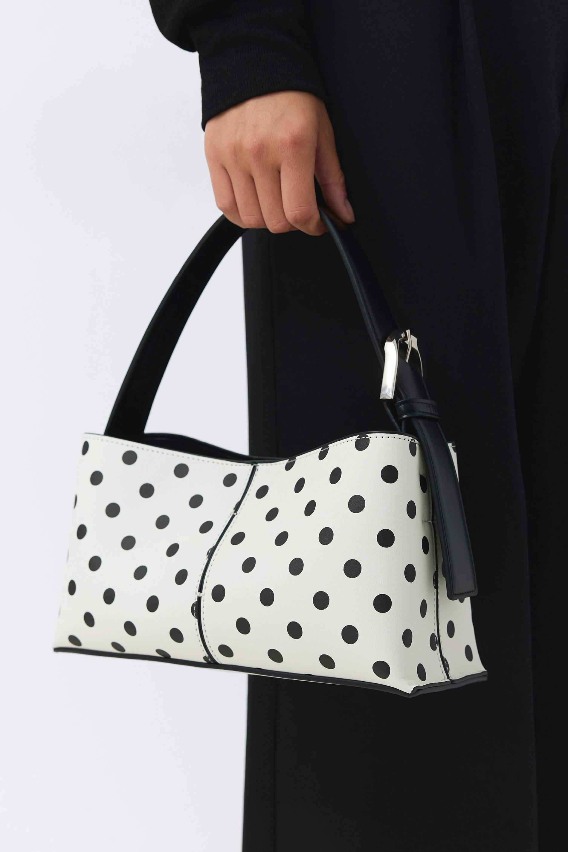 Prickig handväska med ett brett, justerbart handtag. Väskan är svart och vit och har avtagbart axelband. Den har silverfärgat spänne, magnetknäppning och fodrad insida.