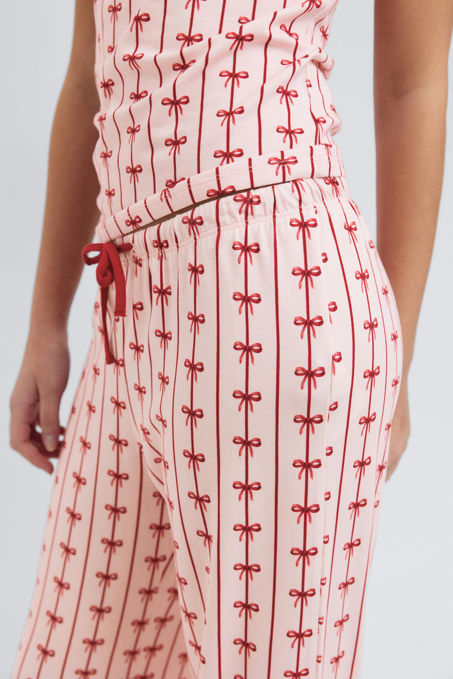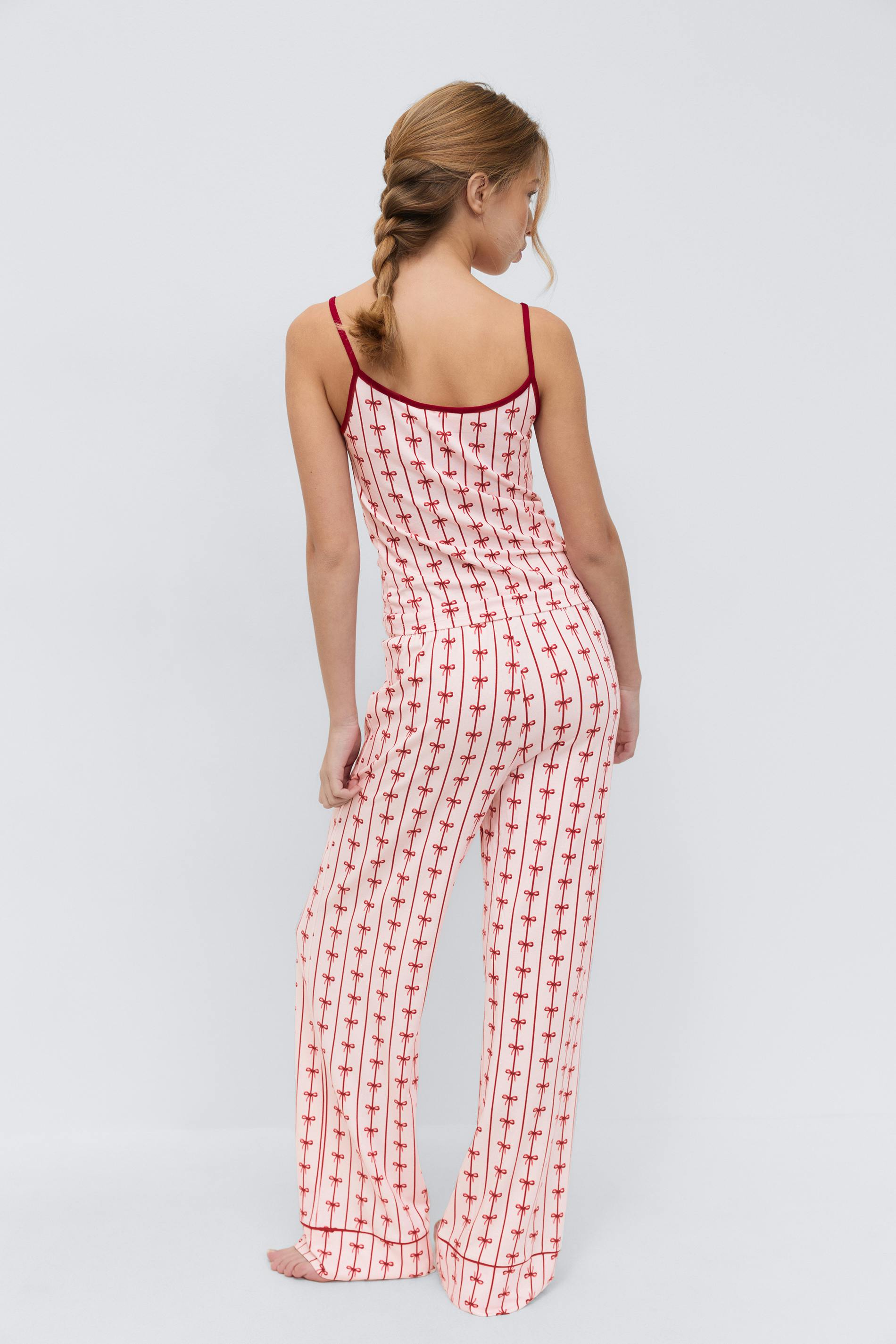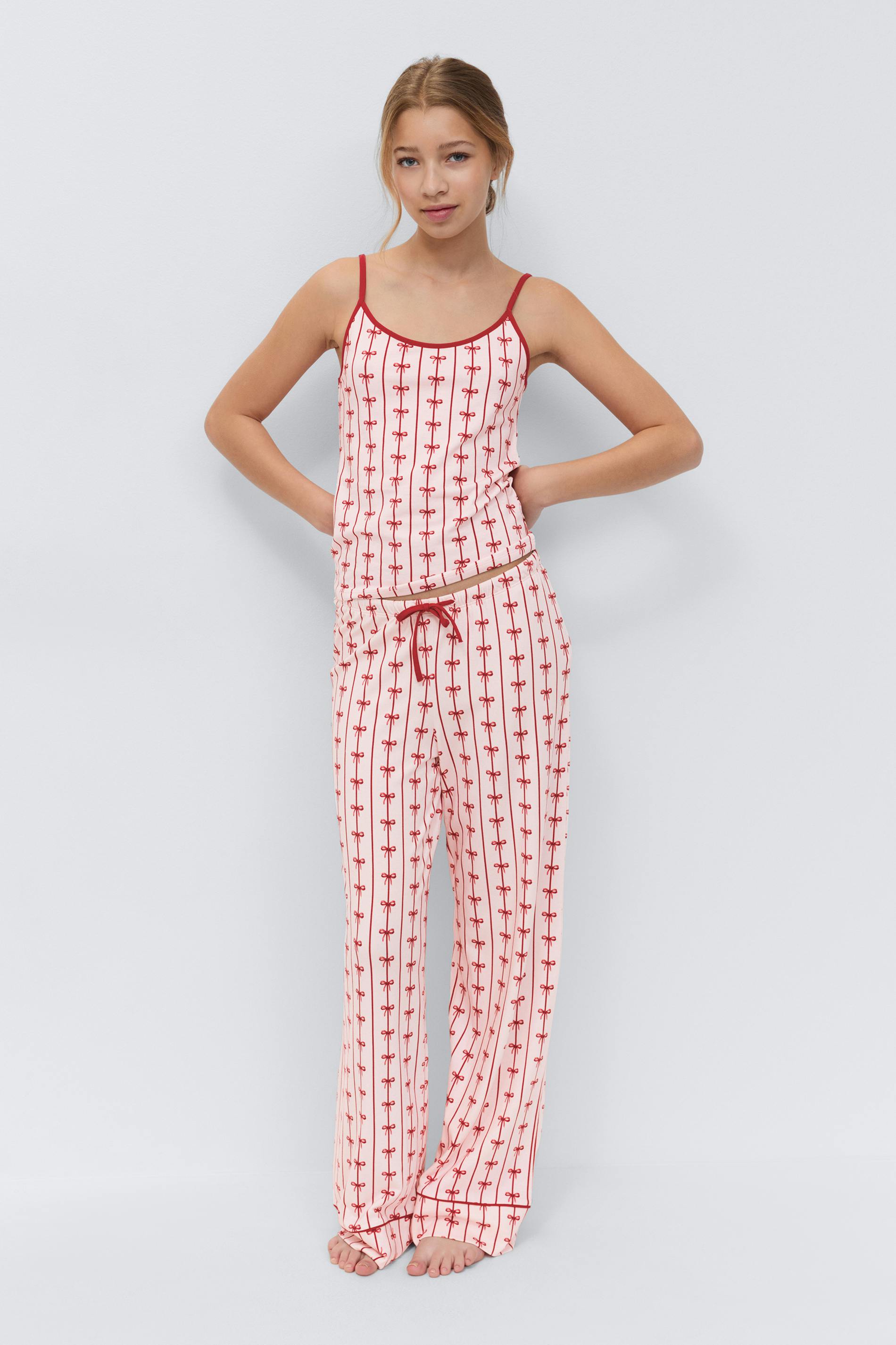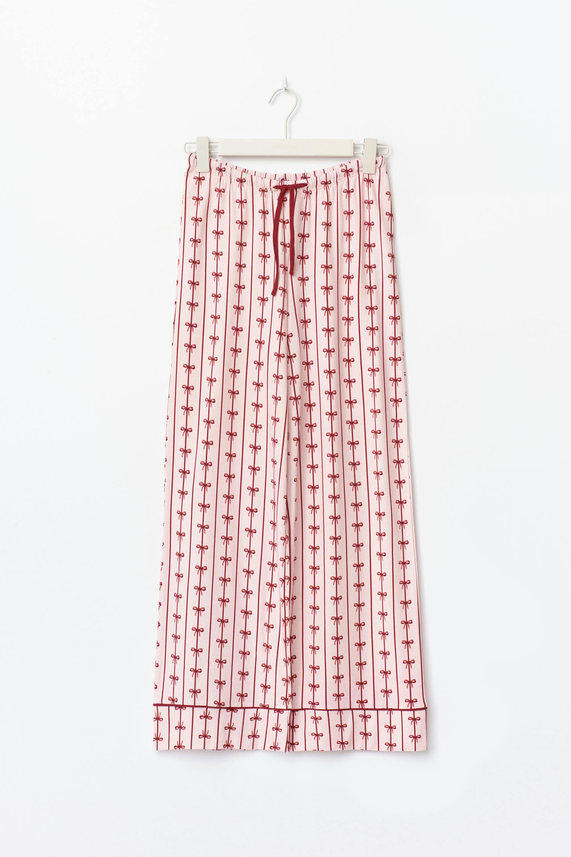 Raka pyjamasbyxor med tryck. Pyjamasen är rosa och har en knytning i midjan. Den har medelhög midja och en normal passform.