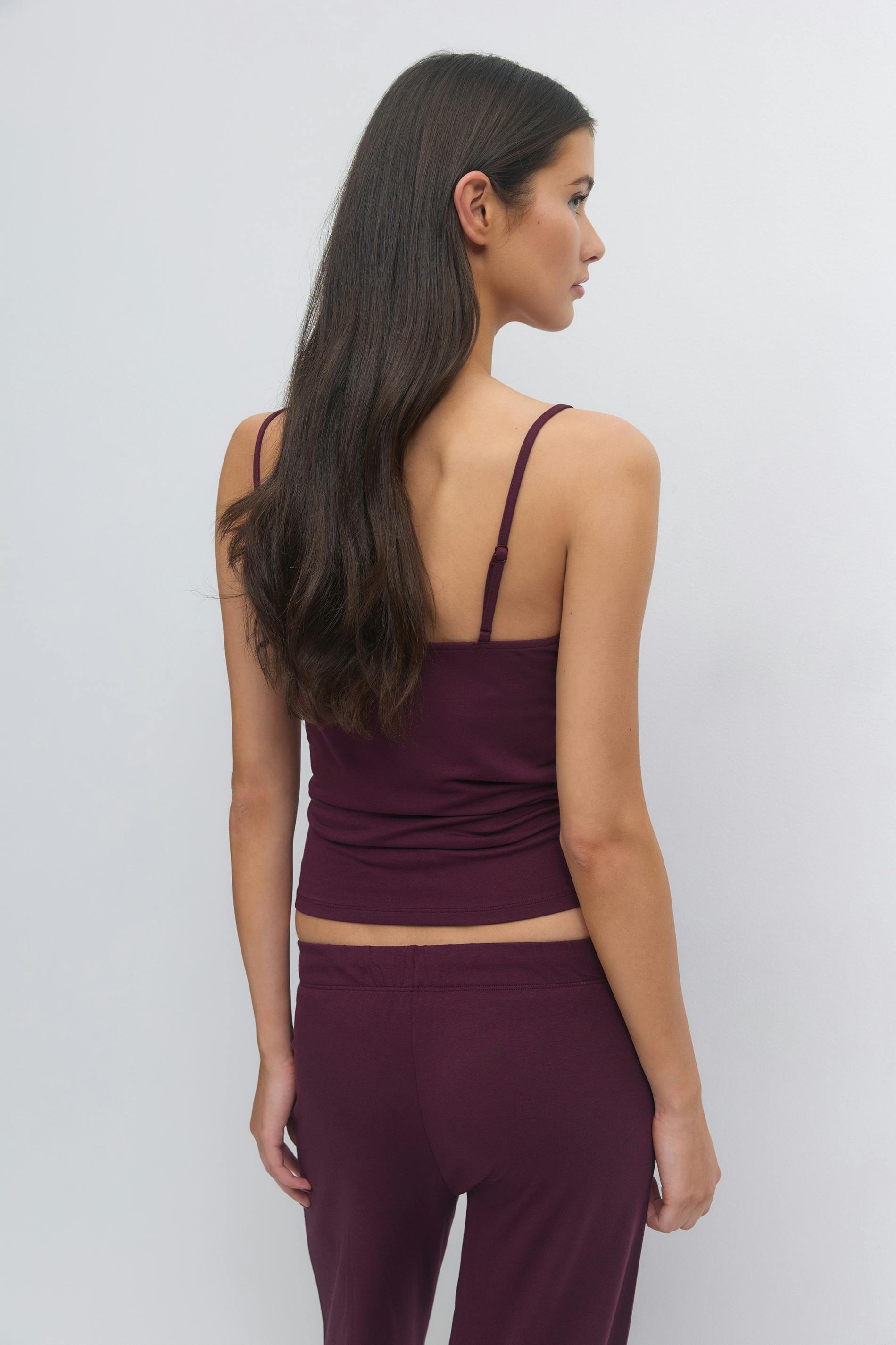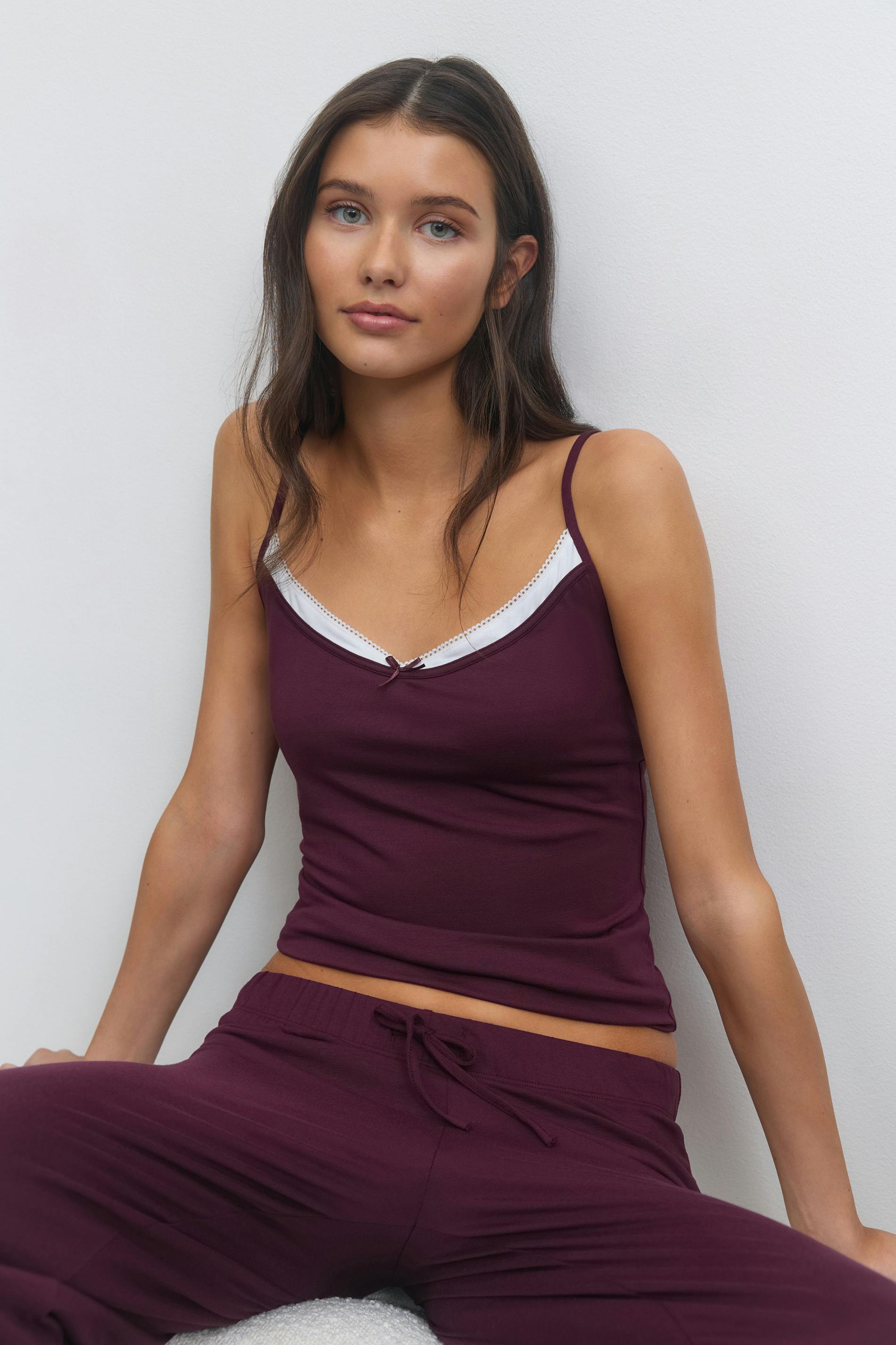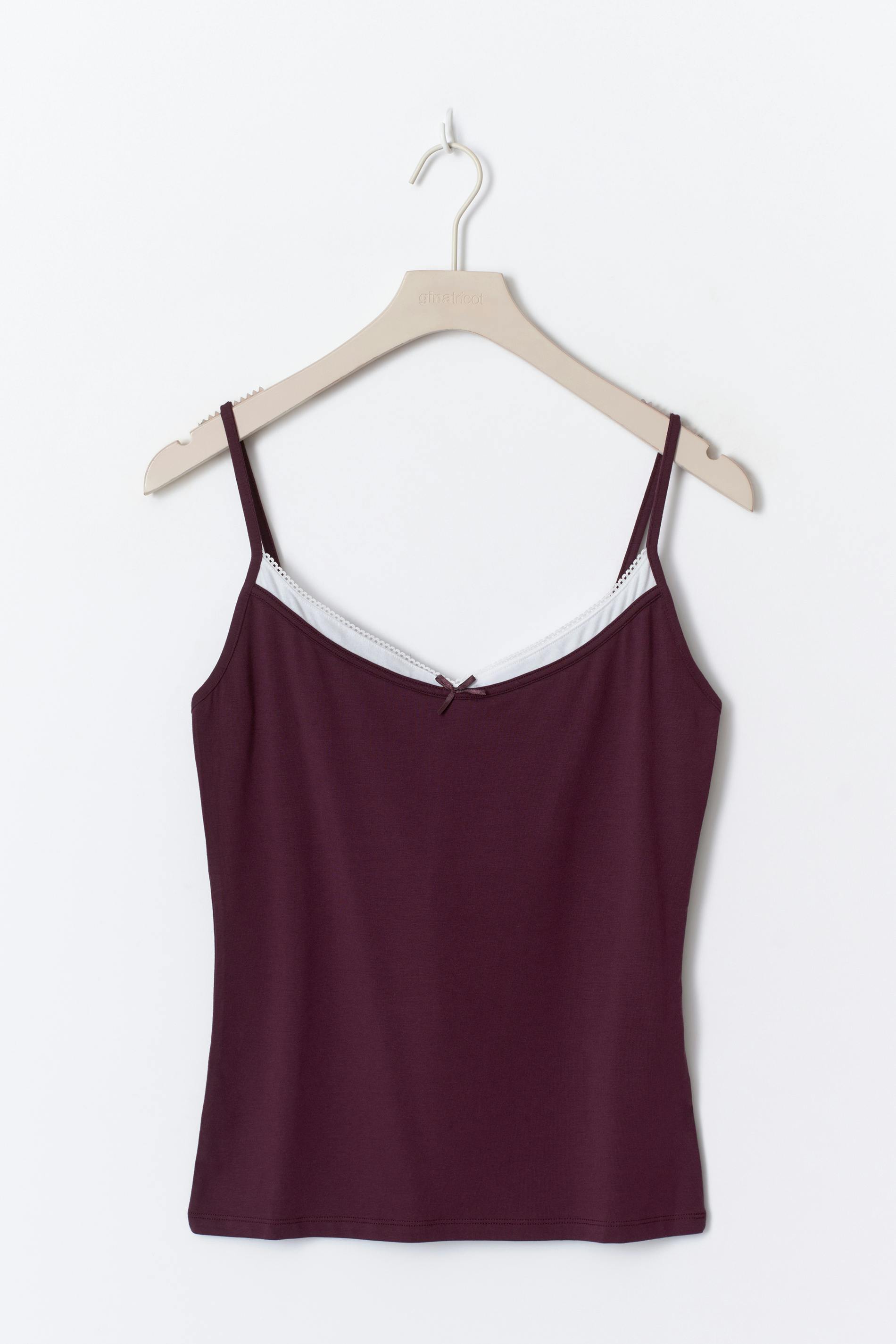 Mjukt linne med en figurnära passform. Linnet är vinrött och har ett stretchigt material. Det har reglerbara axelband, en spetskant kring halsringningen och en rosettdetalj framtill.