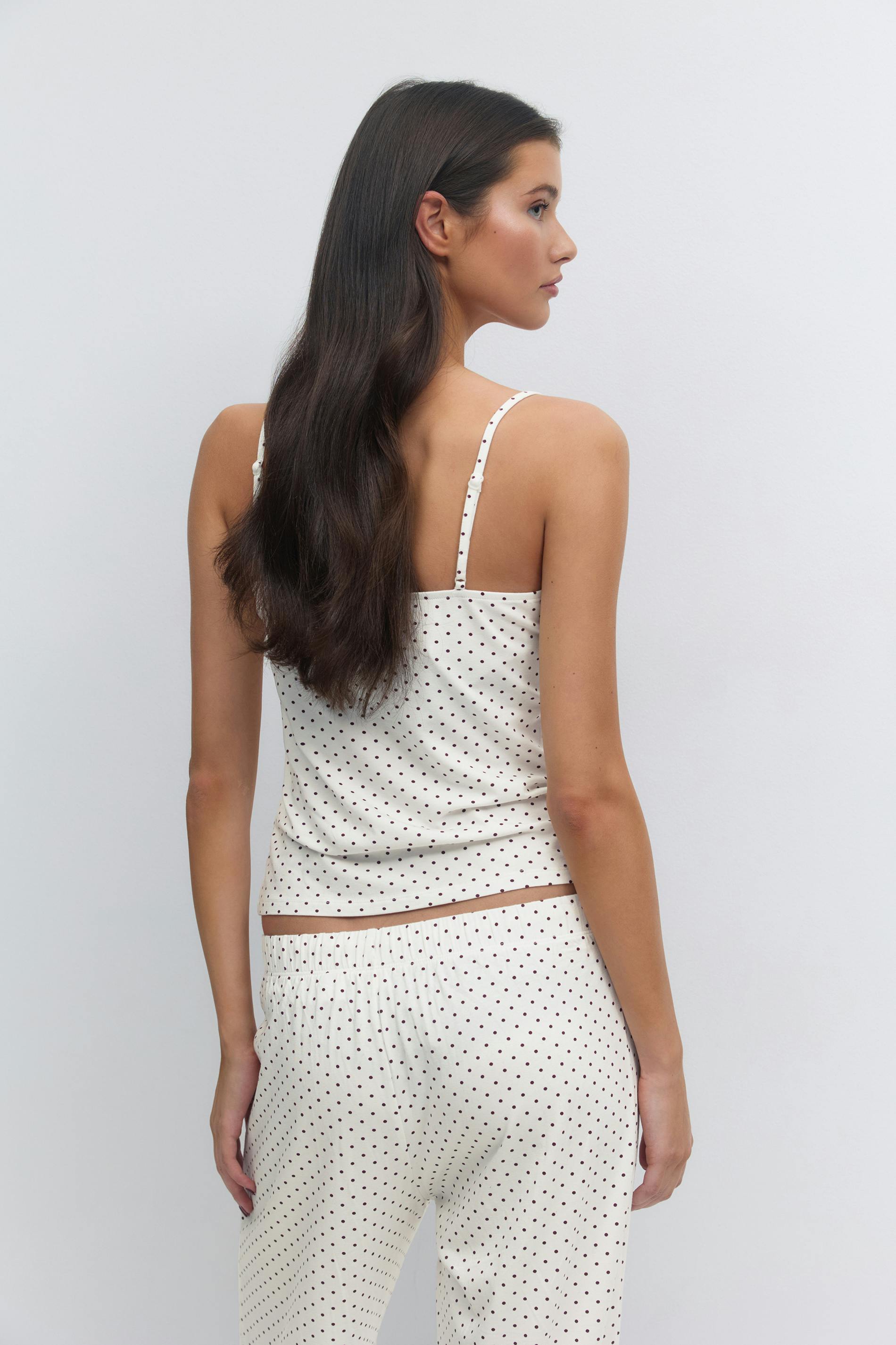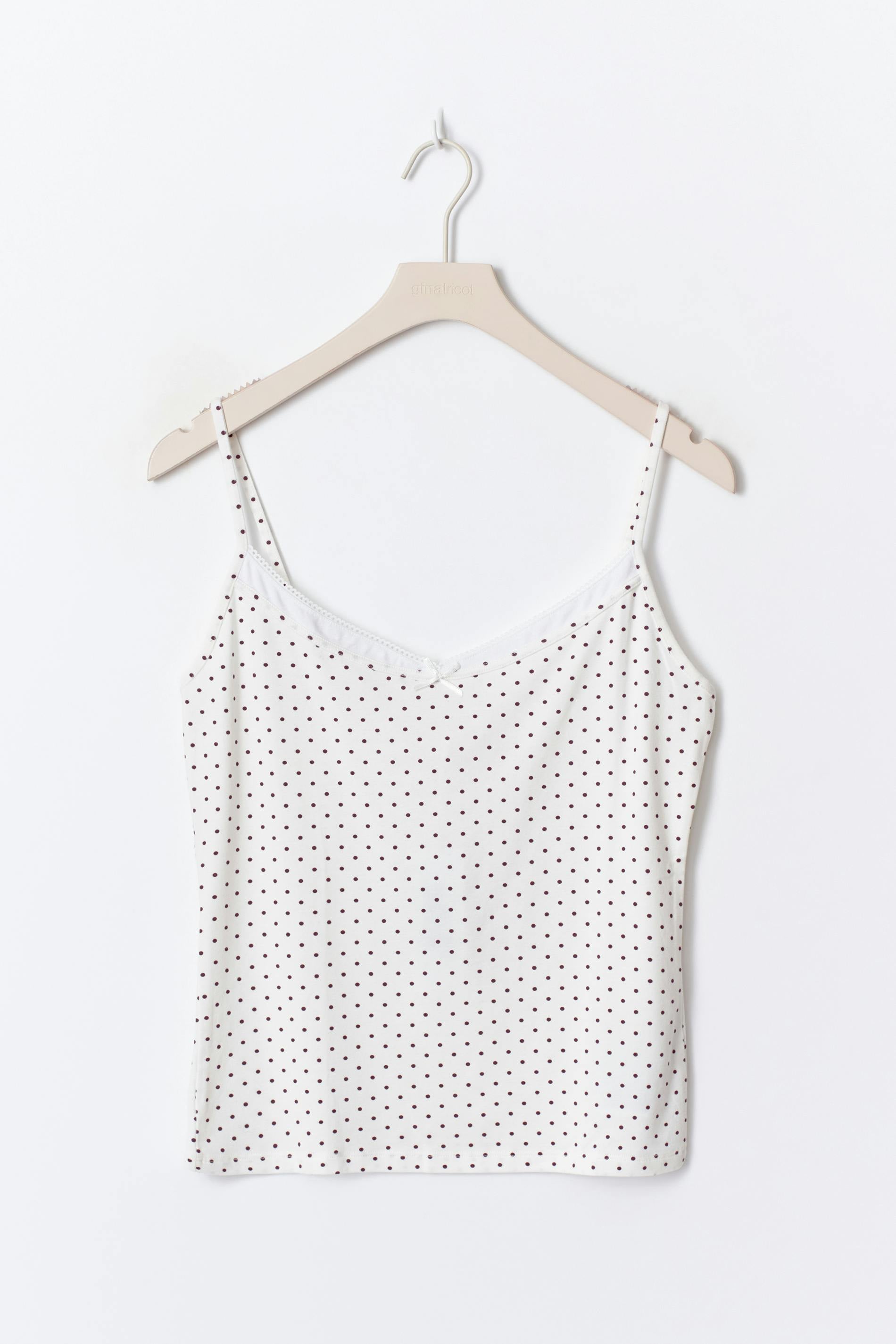 Mjukt linne med ett prickigt mönster. Linnet är vitt och har en figurnära passform. Det har ett stretchigt material, reglerbara axelband, en spetskant kring halsringningen och en rosettdetalj framtill.
