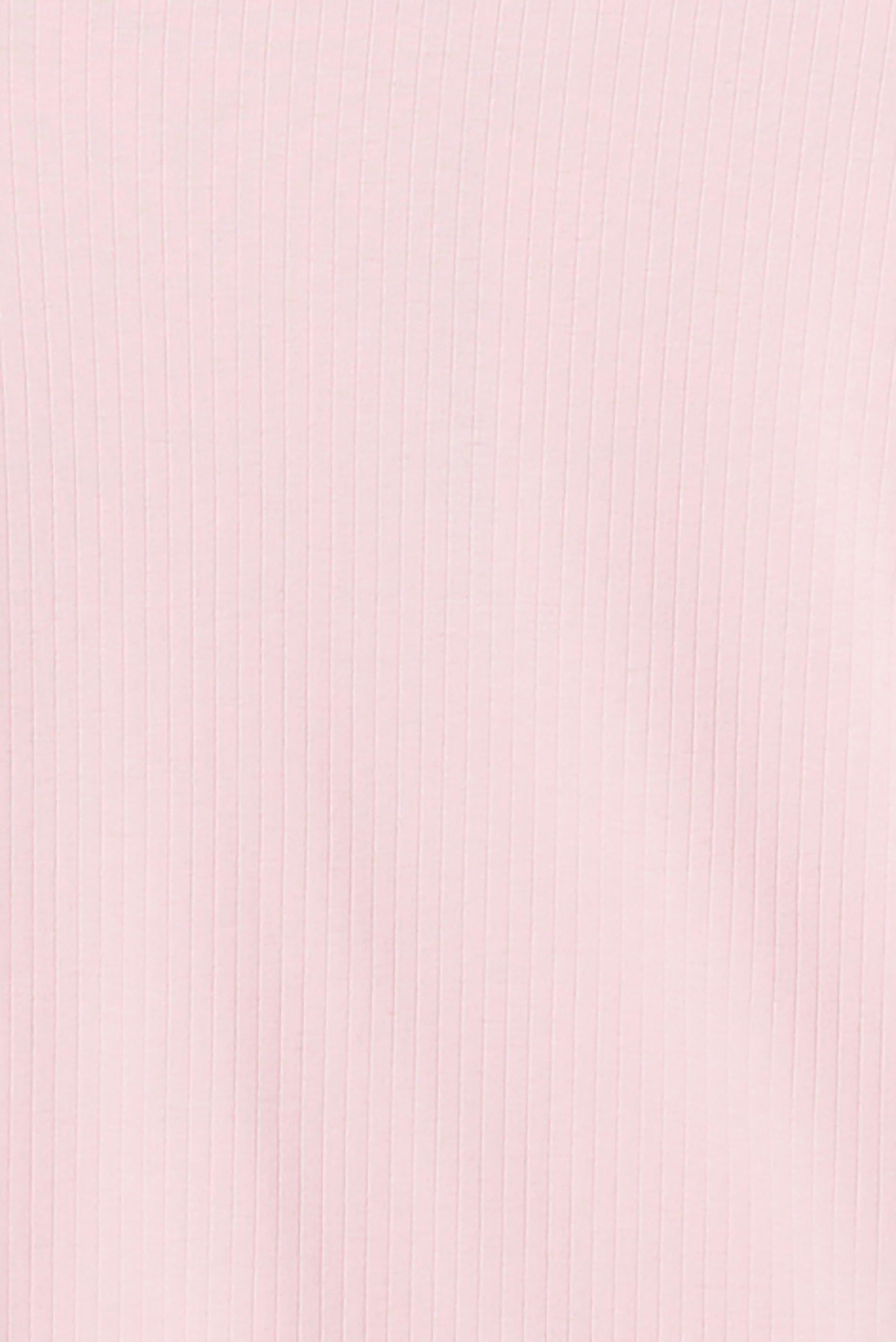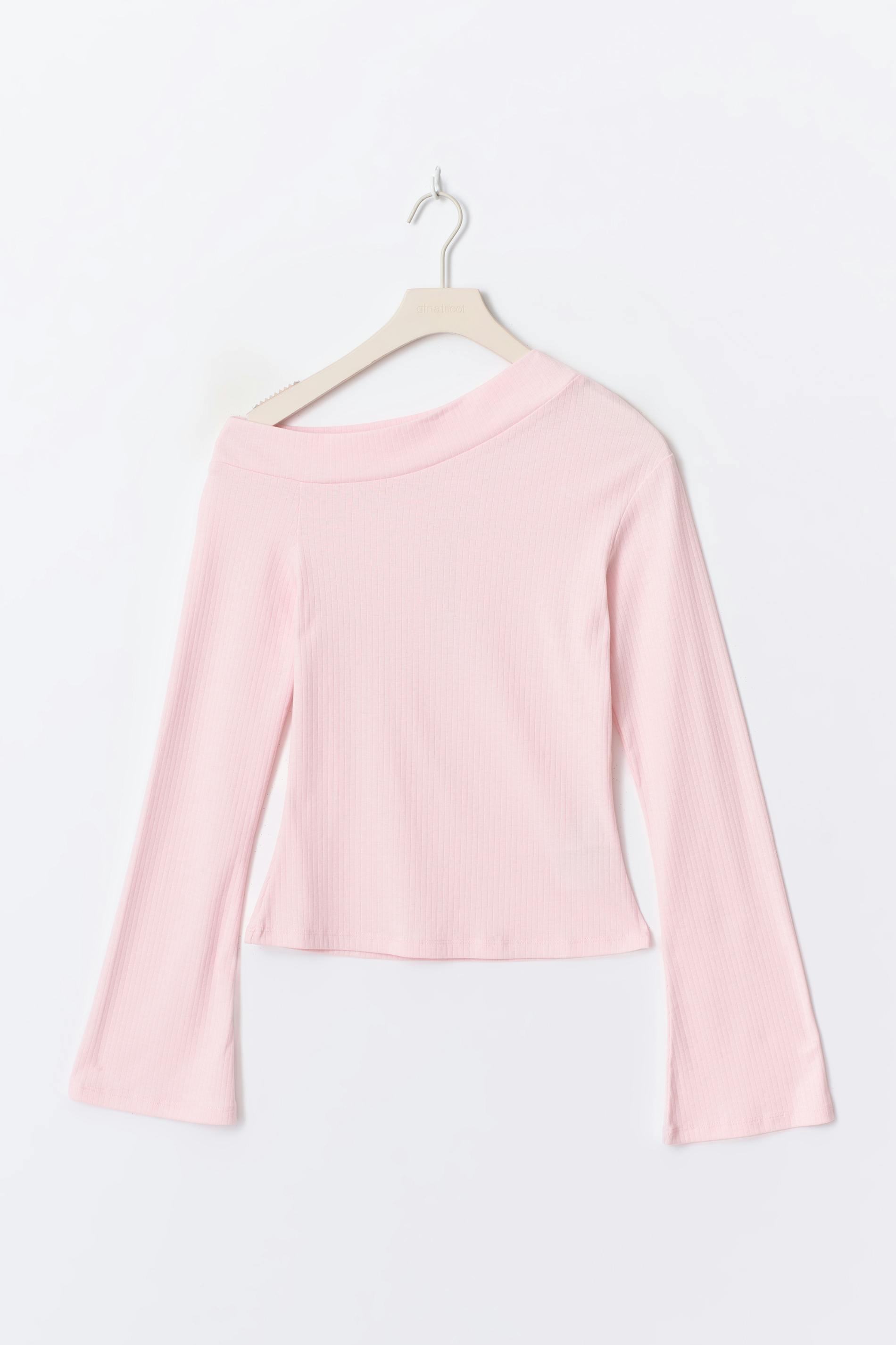 One shoulder topp med en figurnära passform. Toppen är ljusrosa och har ett ribbat material. Den har en lång, vid ärm.