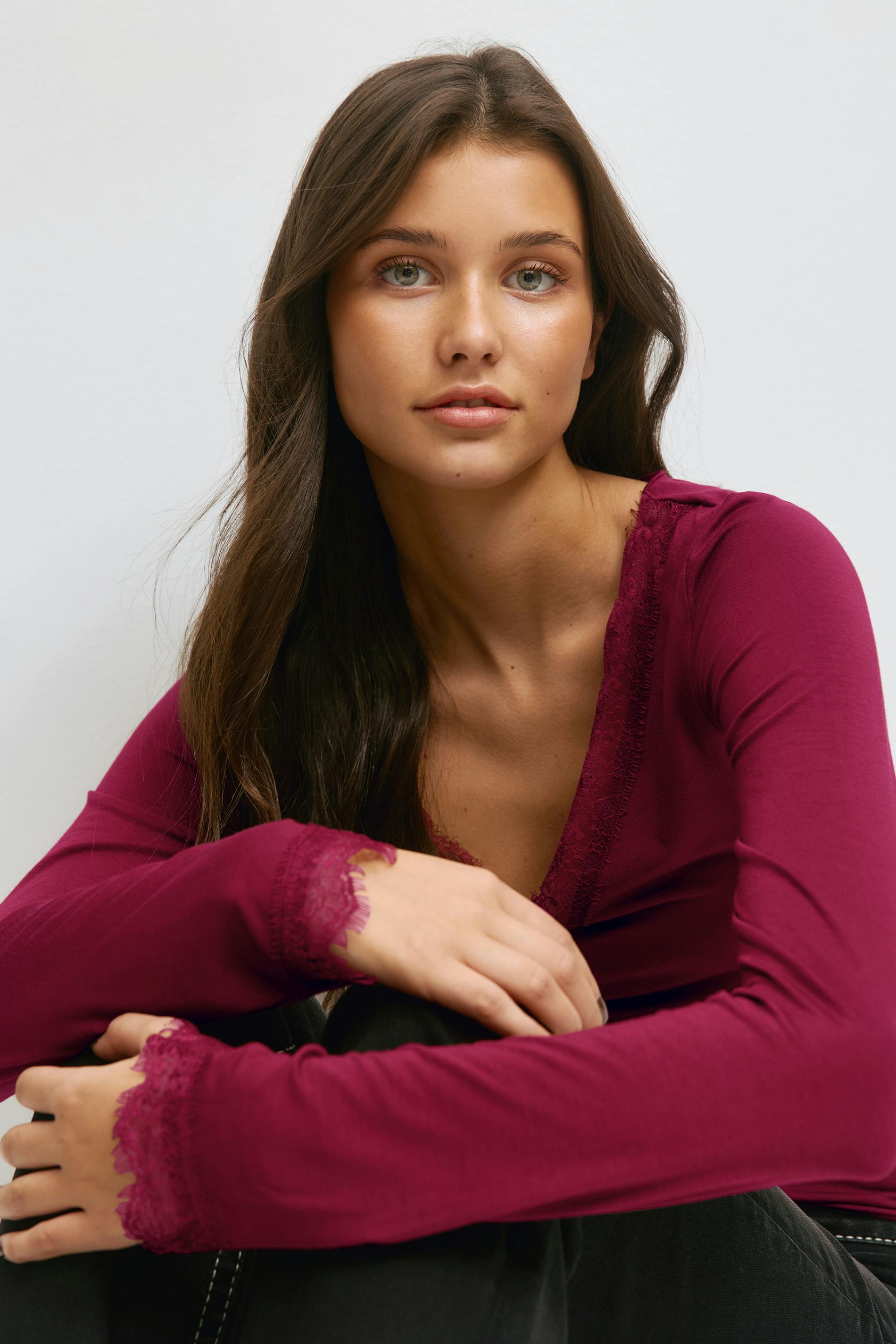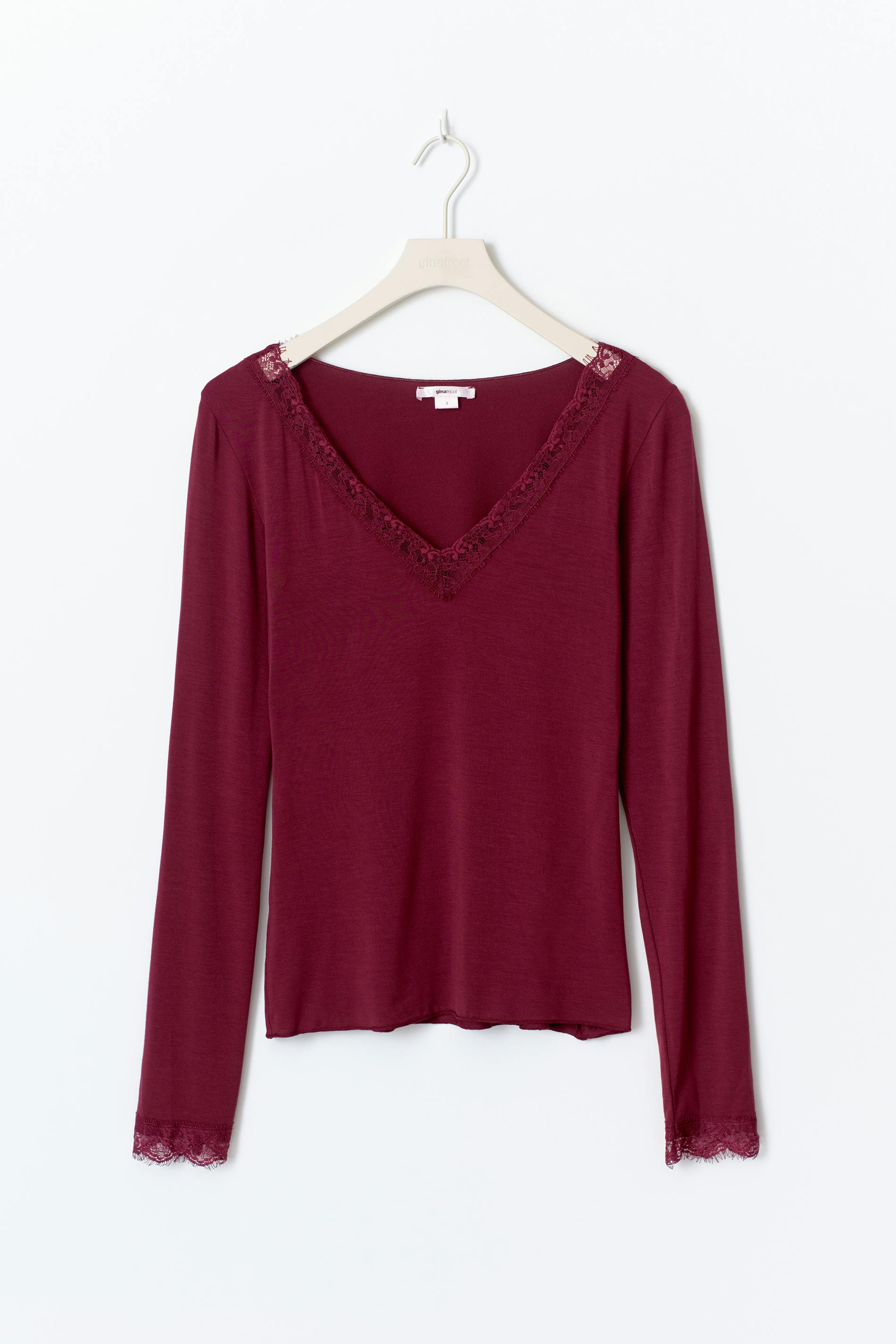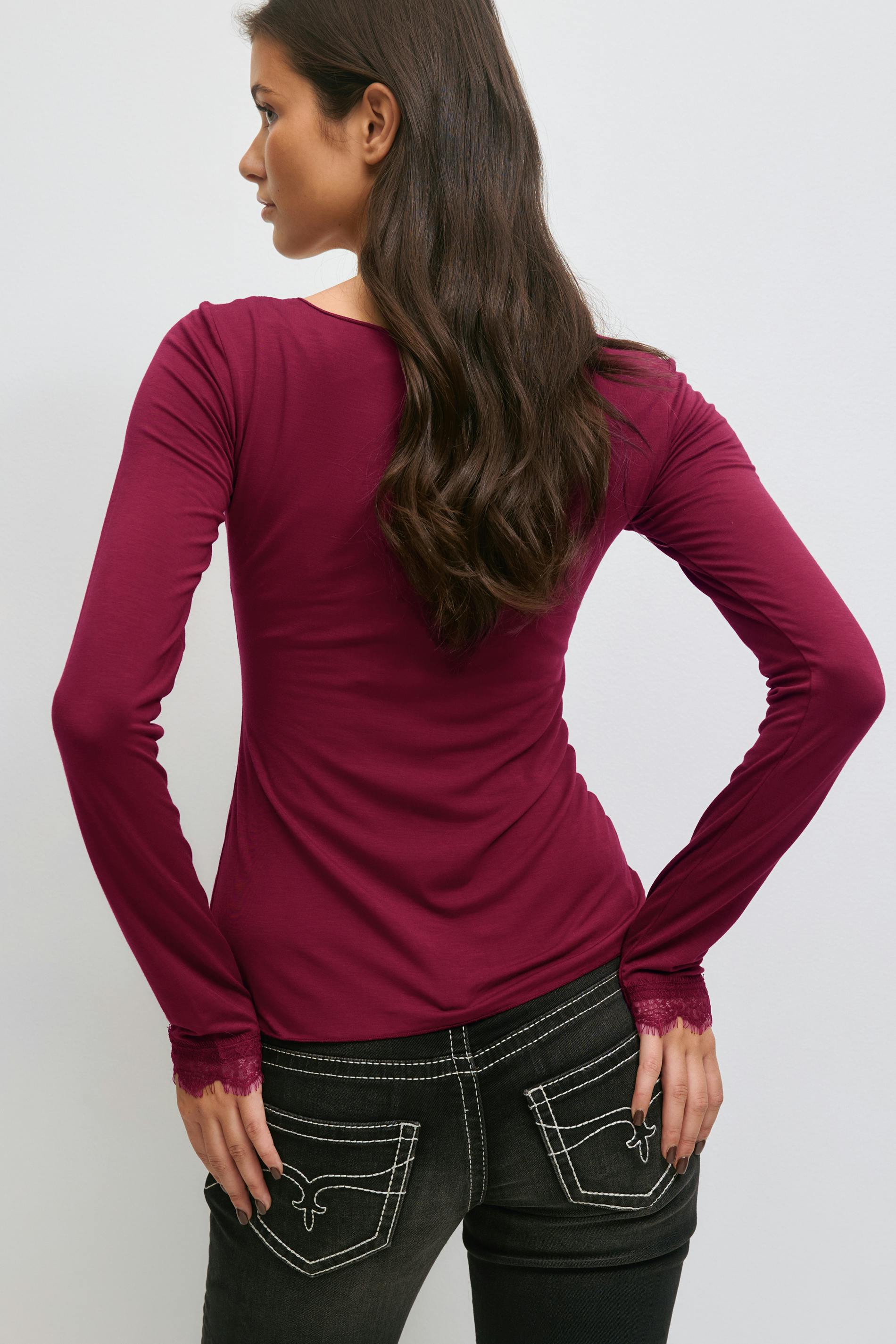 Långärmad topp med en v-ringning. Toppen är mörkröd och har spetsdetaljer vid ärmsluten och över bysten. Den har figurnära passform.