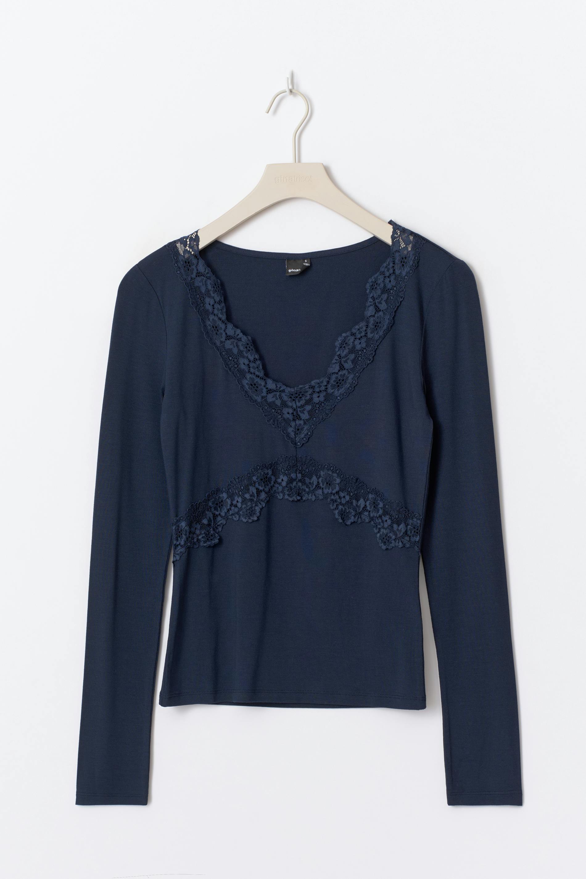 Långärmad topp med ett stretchigt material. Toppen är marinblå och har spets vid uringningen och under bysten. Den har en figurnära passform.