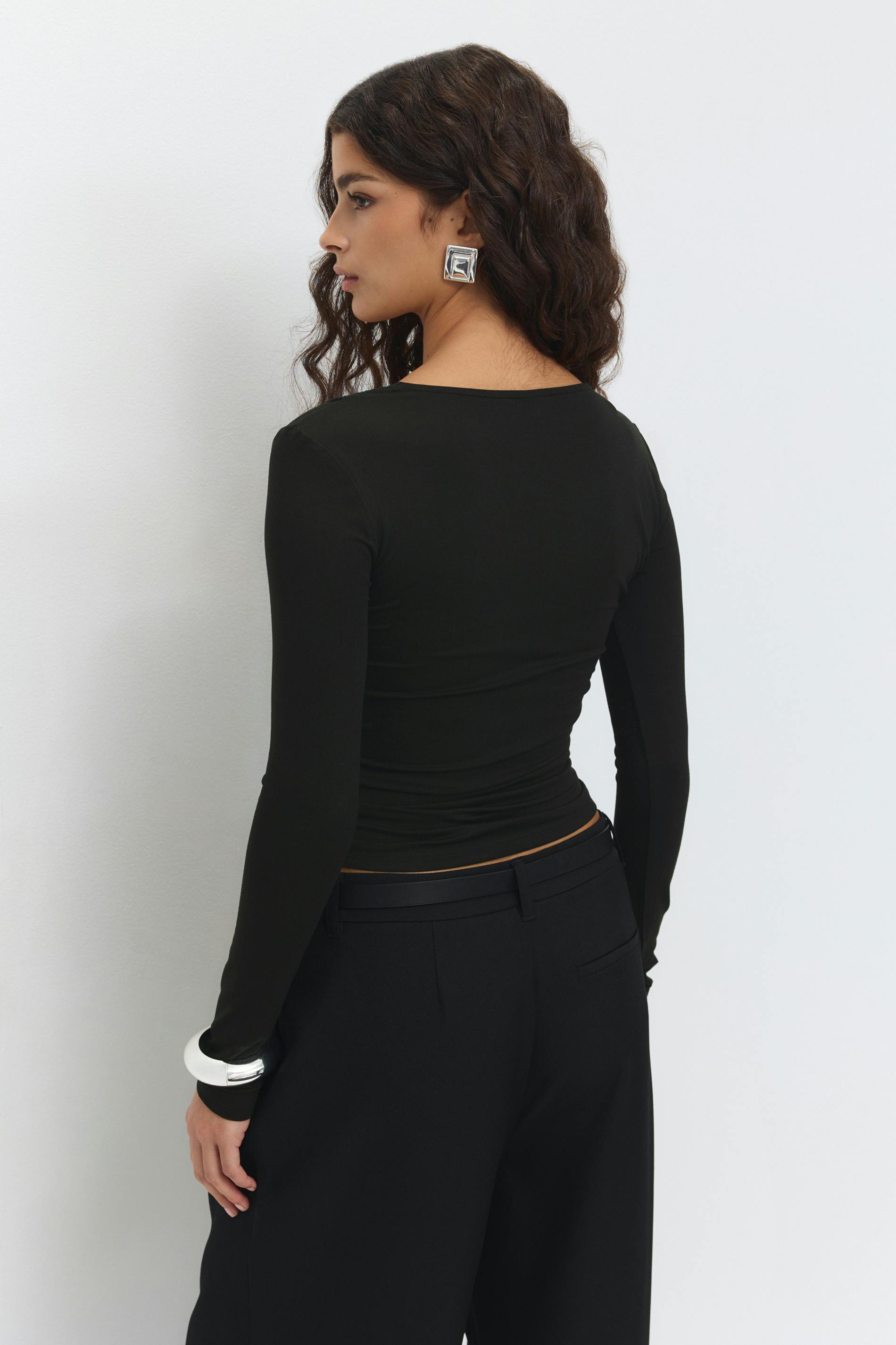 Långärmad topp med ett stretchigt material. Toppen är svart och har spets vid uringningen och under bysten. Den har en figurnära passform.