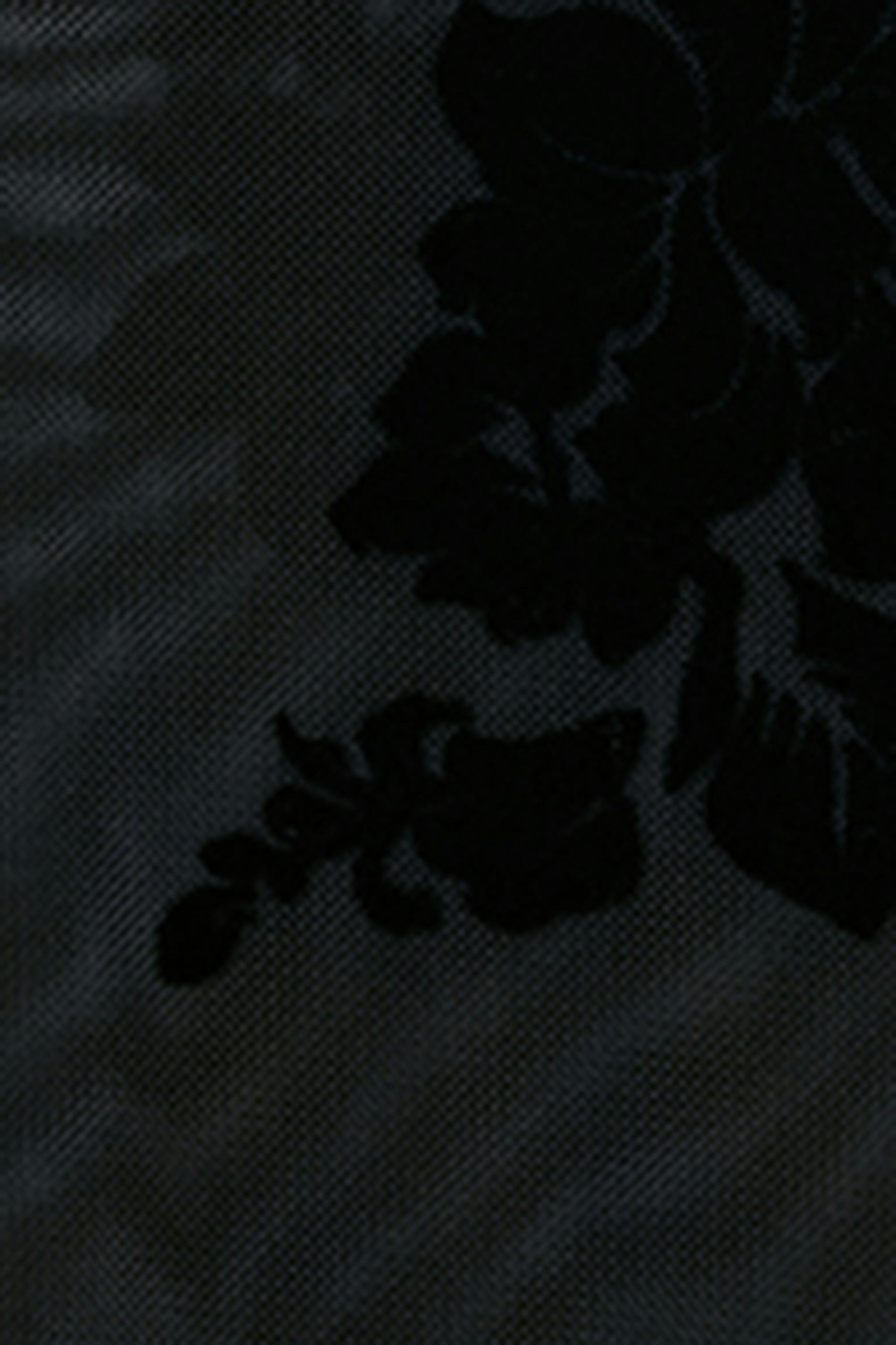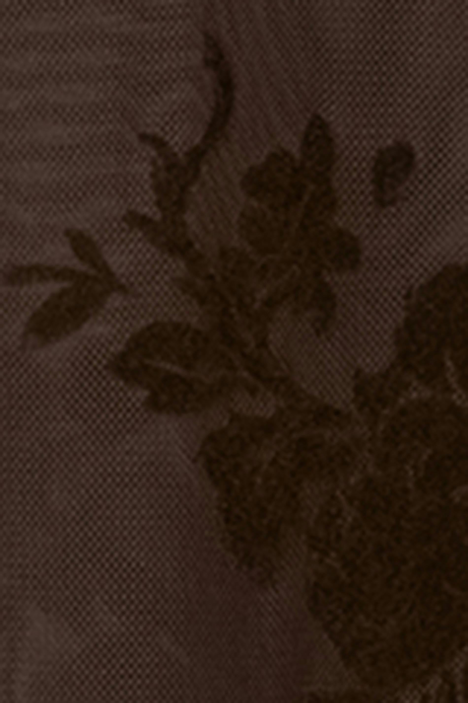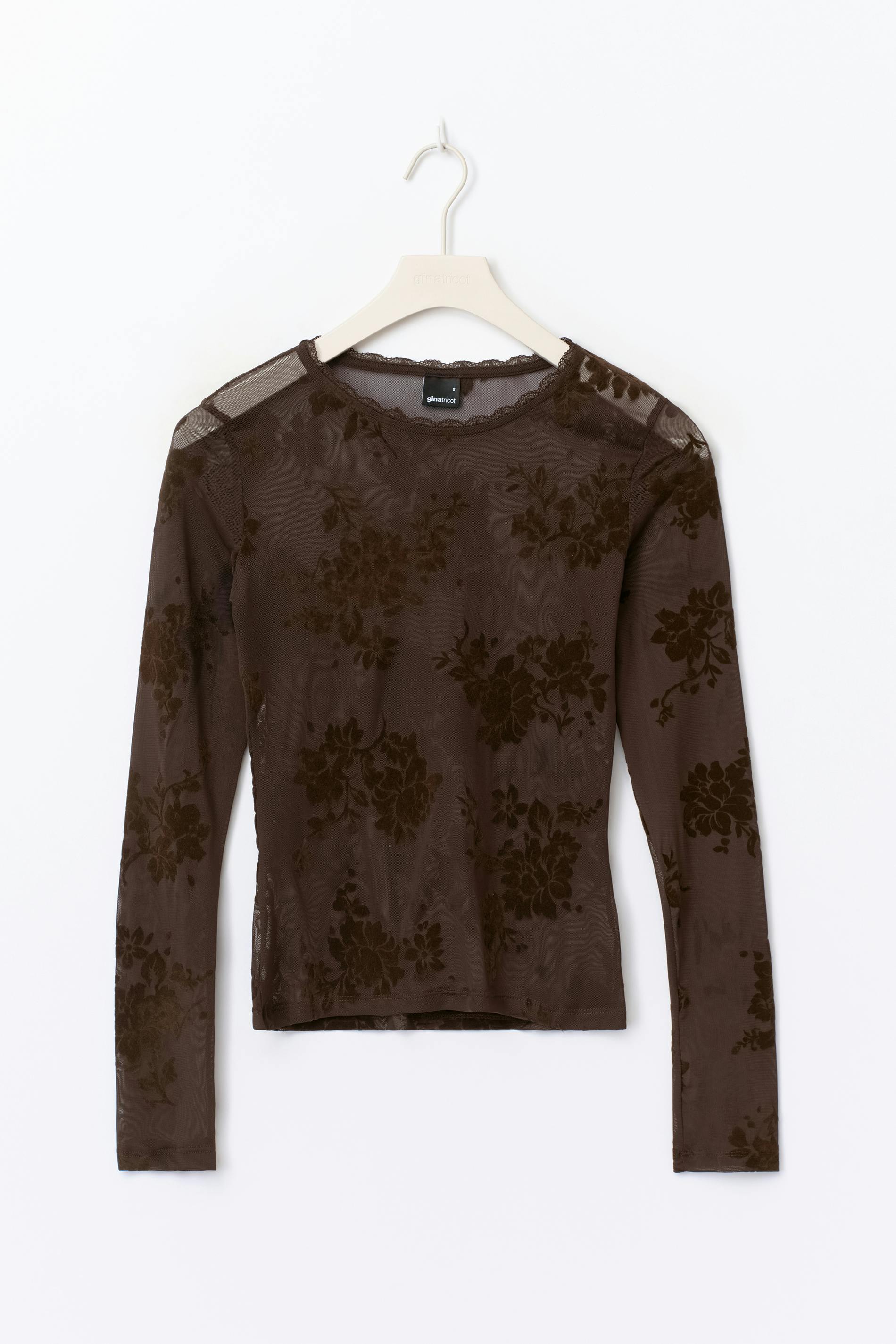 Långärmad meshtopp med blommigt mönster. Toppen är brun och har spetsdetalj upptill. Den har figurnära passform, rund halsringning, transparent material och normallängd.