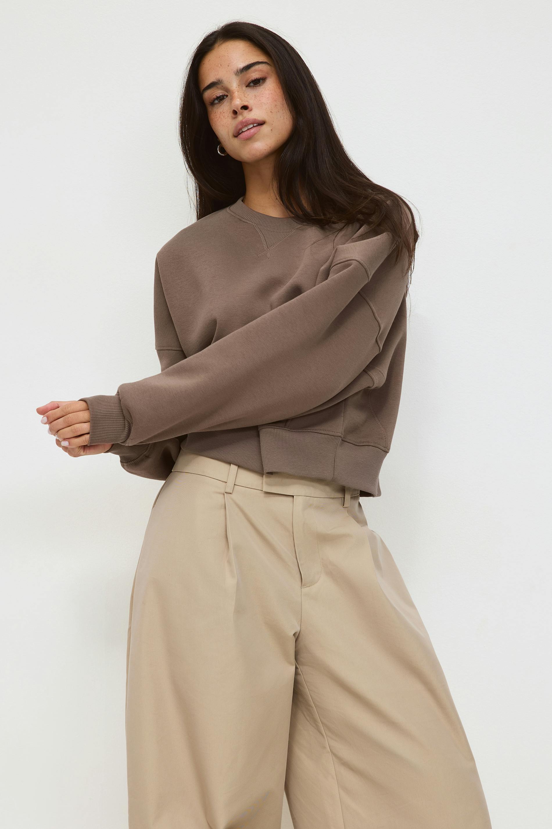 Croppad sweatshirt med mjuk borstad insida och bred, avslappnad passform. Med dekorativa sömdetaljer samt ribbmudd vid ärmsluten och i nederkant. I färgen brun. The everyday layer.