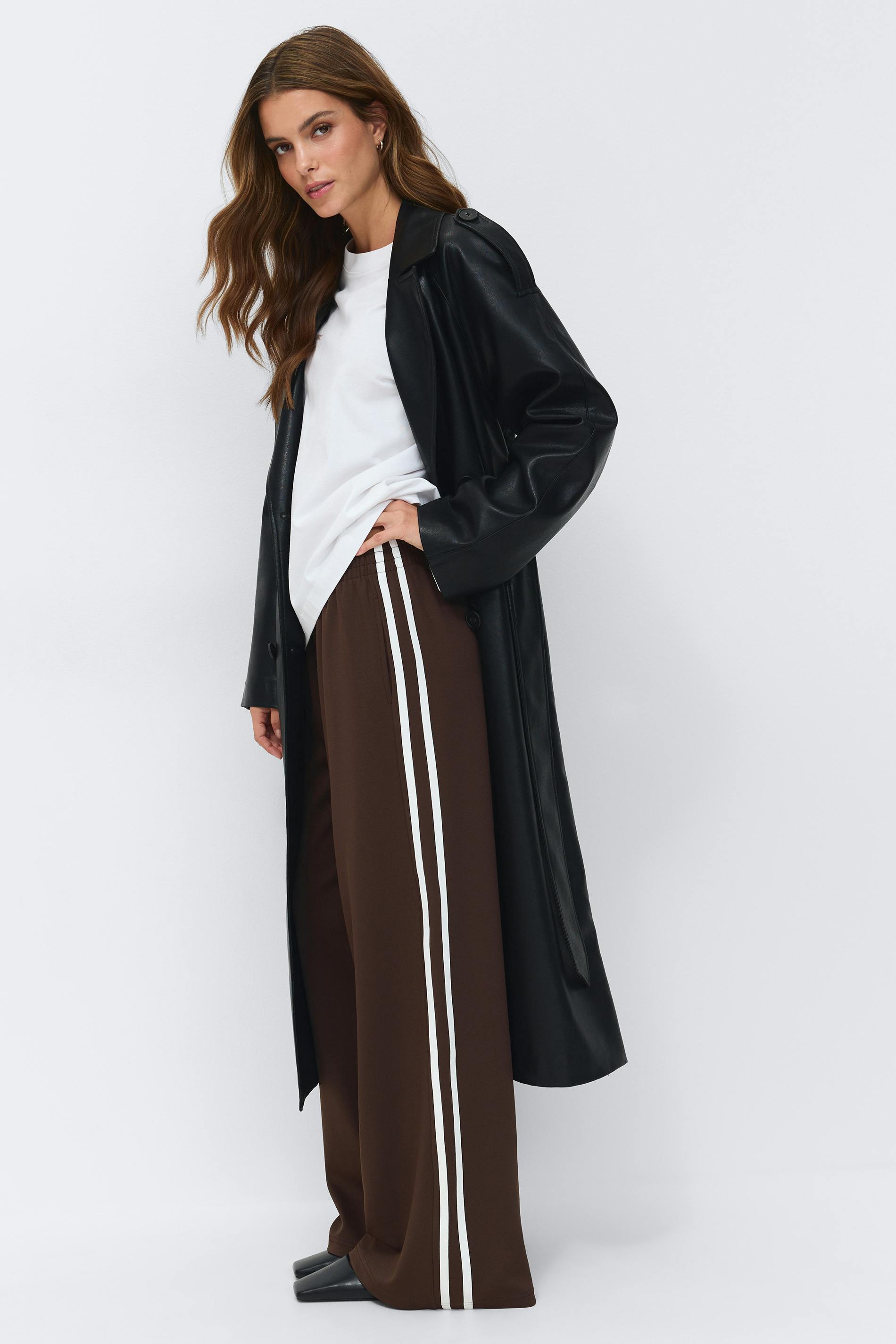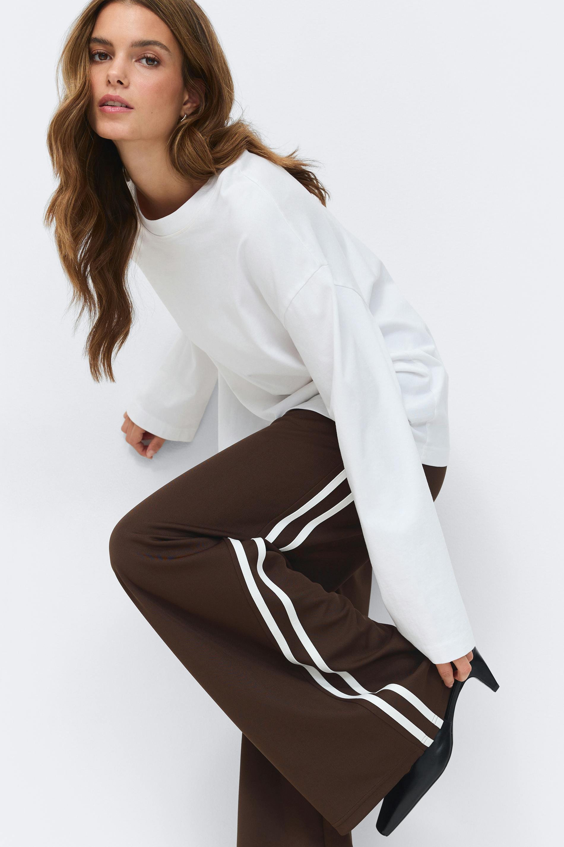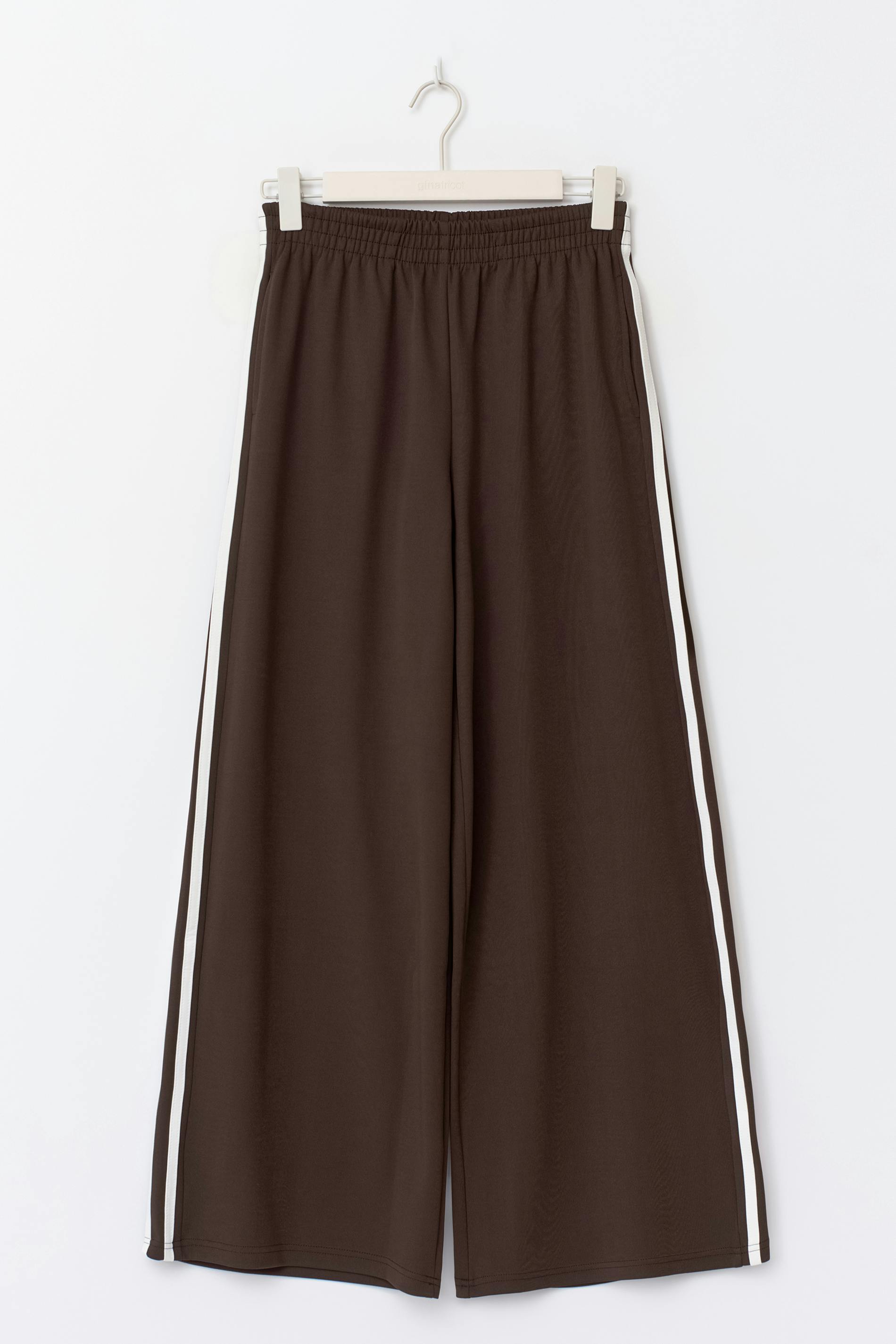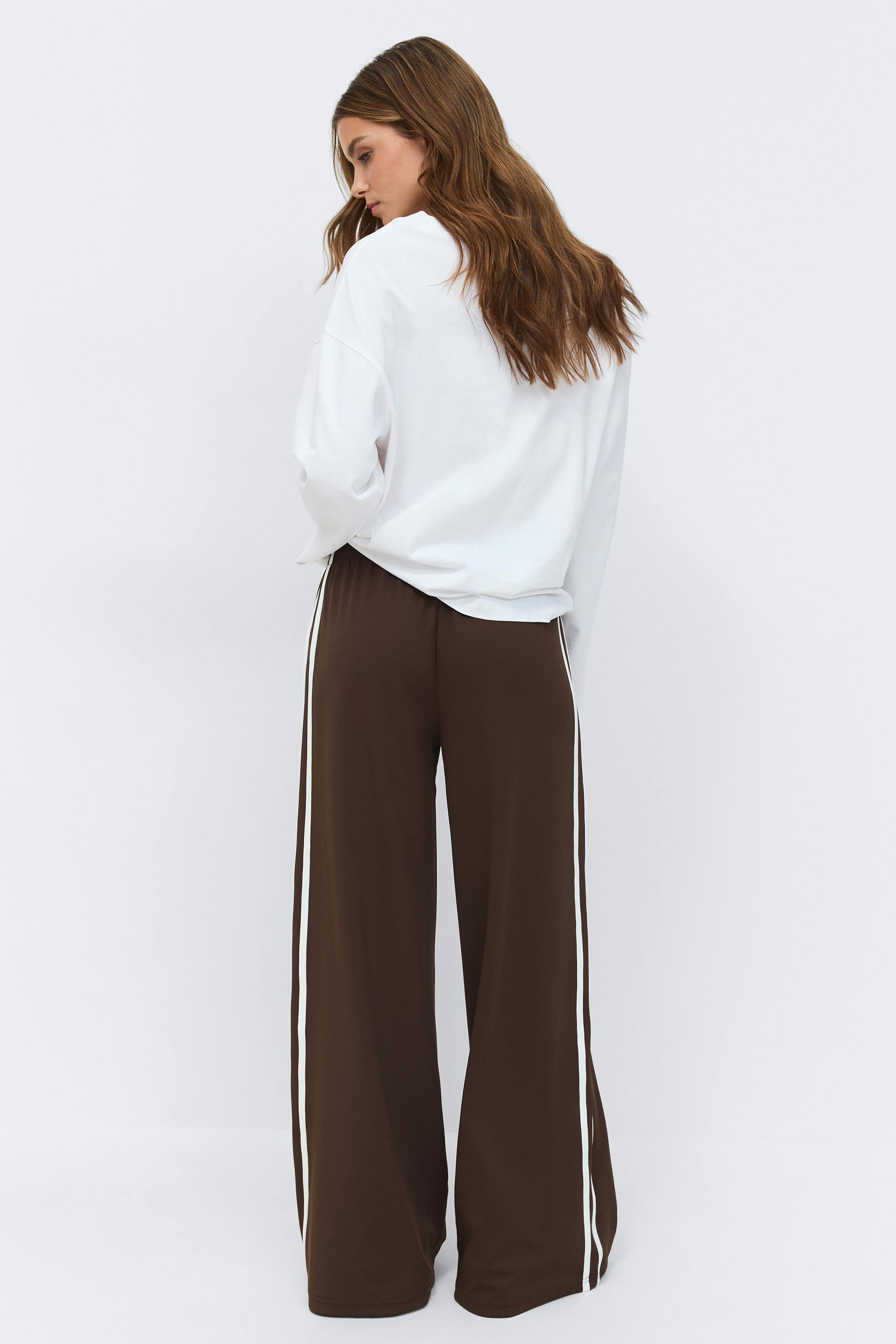 Sportiga mjukisbyxor med vida ben. Byxorna är bruna och har vita ränder i sidorna. De har resår i midjan, normal passform och fickor i sidorna.