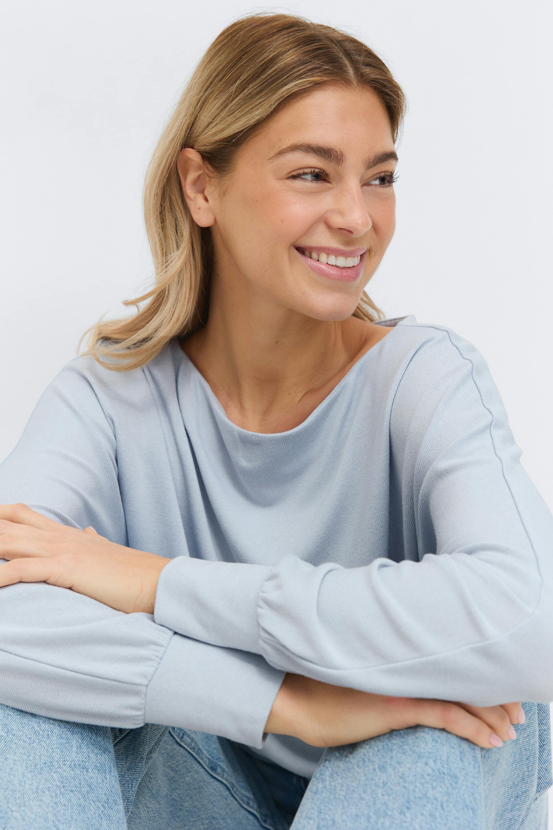 Långärmad topp med båtringning. Toppen är blå och har figurnära midja. Den har normal passform och manschetter vid ärmsluten.